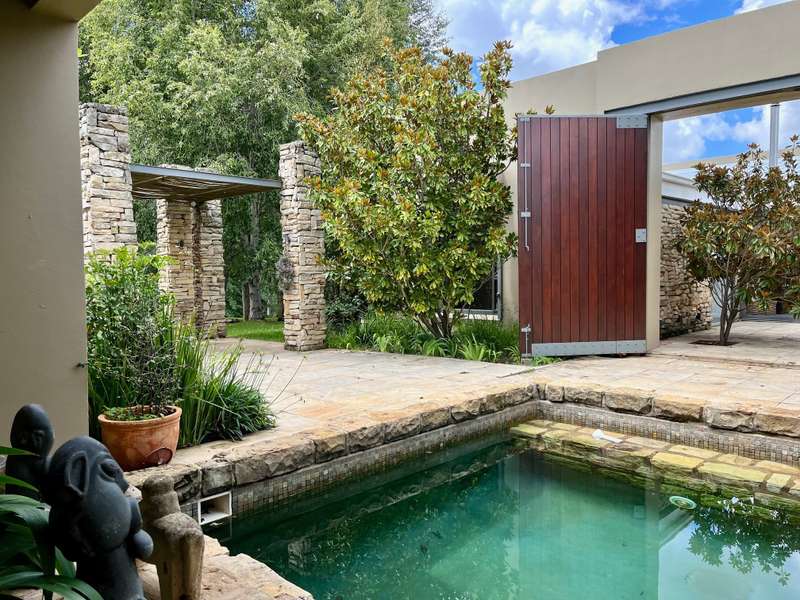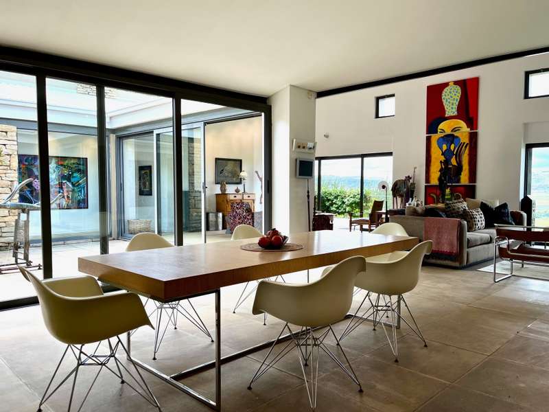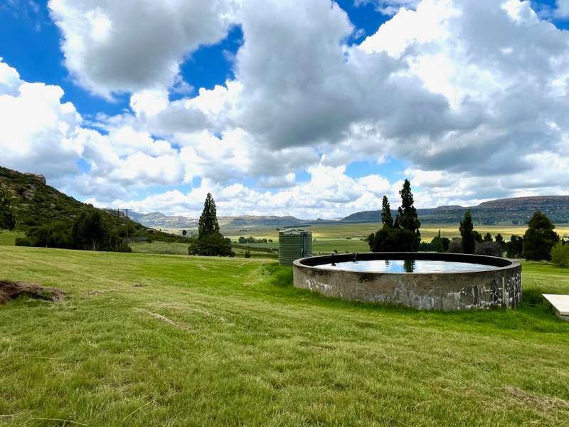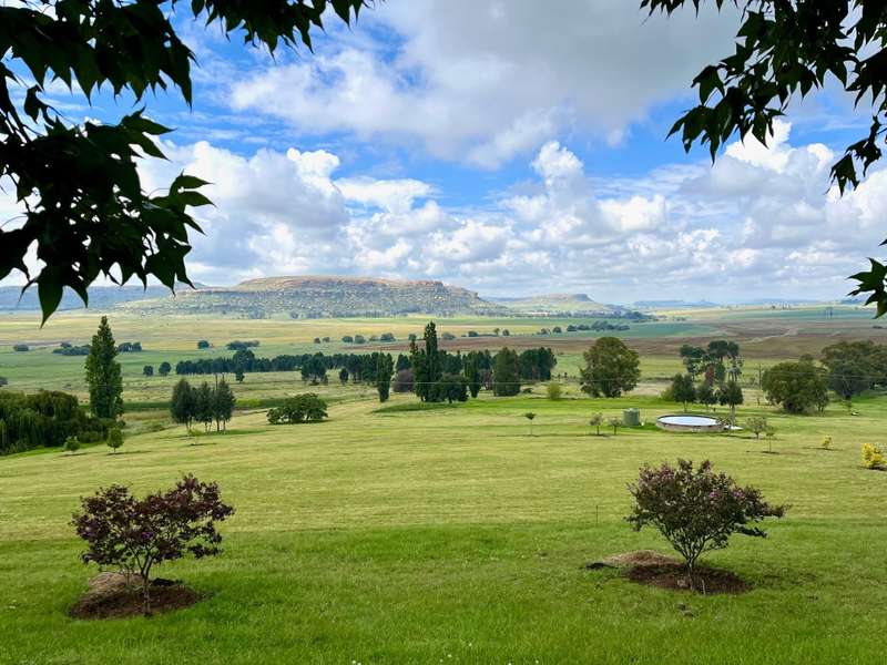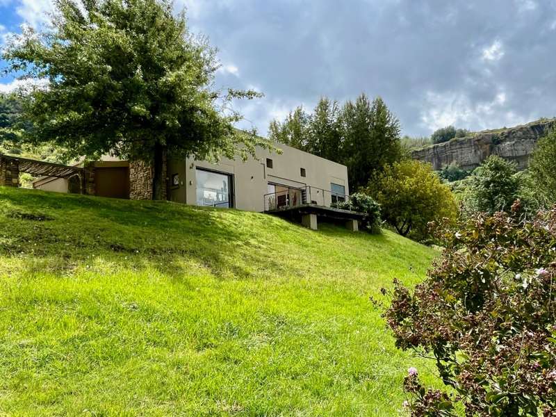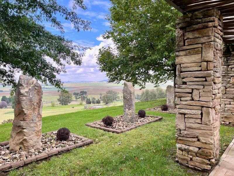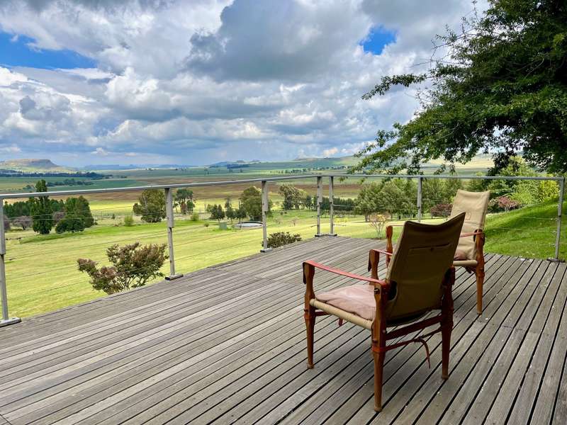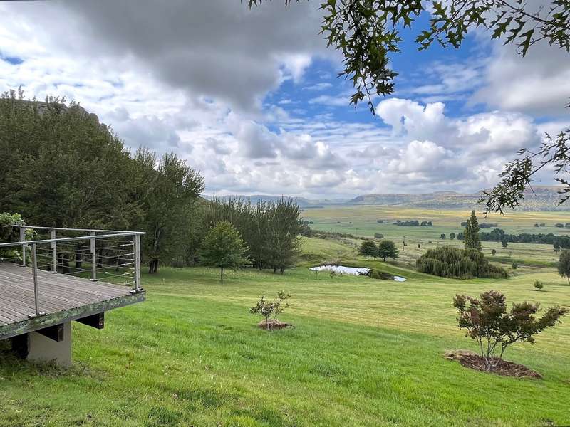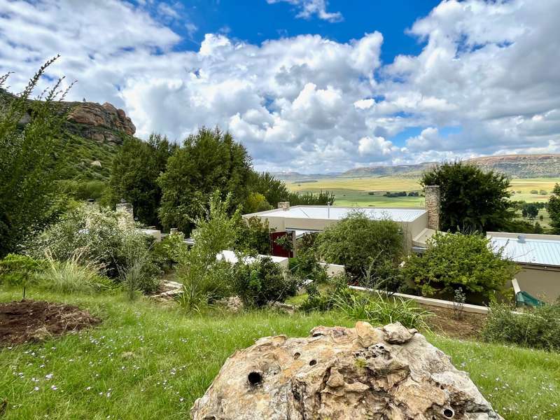 Perched dramatically on the side of an amphitheatre of the Grootnek mountain in the Eastern Free State, this architecturally designed 85-hectare property offers a truly extraordinary living experience. Masterfully hewn from the mountain, this modern sanctuary, with sandstone accents, provides spectacular panoramic views of the majestic surrounding mountain ranges. The main residence features two generous bedrooms, each with its ensuite bathroom, designed with luxurious comfort in mind, and thoughtfully positioned to maximize the breathtaking vistas. The open-plan living spaces create a remarkable sensation of "living in the sky," with the magnificent landscape unfolding before you from the deck and the enormous windows. A custom-built kitchen, a separate scullery, an outdoor pantry, a gas hob and an electric oven create the perfect space to cook and host dinner parties. A separate guest cottage provides additional accommodation with two more rooms, featuring ensuite bathrooms. The cottage has an open-plan living and dining area with a fitted kitchen. Discarded sandstone pillars frame a circular outside fireplace – a site for evening meditation that captures the magic of the unending countryside. The property boasts two dams and a reservoir, filled by three natural mountain springs that provide 27 000 litres of water per day, year-round. The springs feed into three water tanks which overflow into a reservoir. The garden, including the orchard with apple, cherry, lemon and persimmon trees, is serviced by a computerized irrigation system. The property's natural sandstone construction harmonizes beautifully with the surrounding landscape, creating a seamless connection between the built environment and the dramatic natural setting. This is more than just a home; it's an exclusive retreat that captures the essence of luxury living in one of South Africa's most picturesque regions. The property is situated between Rosendal and Ficksburg Architect - Johan Bergenthuin Featured in Visi Magazine February 2011 Underfloor heating throughout the main house and cottage Heated towel rails in all bathrooms in the main house and cottage Morso fireplaces in the main house and cottage Outside built-in braai at the guest cottage Outside fire pit Two fully-appointed staff accommodations Metal roller-shutter security over all windows and access points. No permanent residency on the farm. 3 phase electrical supply directly from Eskom Comprehensive plans and engineering specifications are available on request