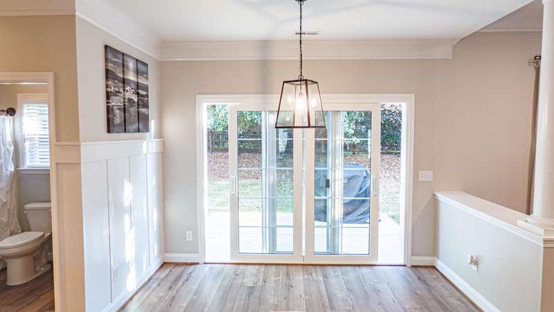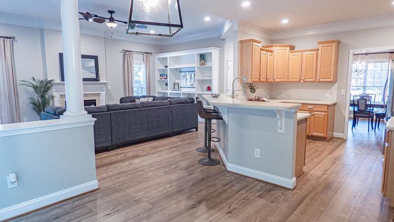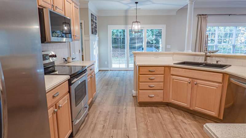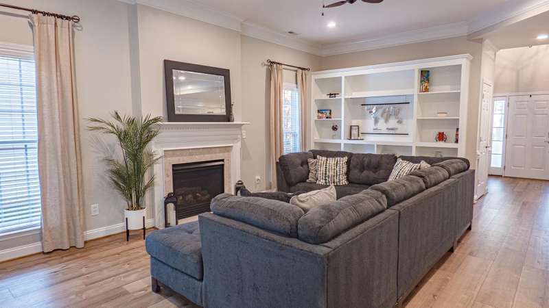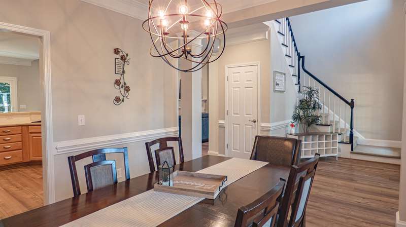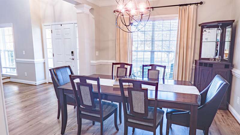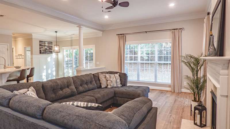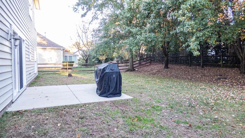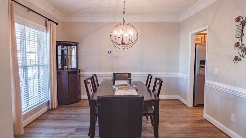 Welcome to this beautifully maintained home that blends comfortable living with thoughtful design details throughout. A covered front porch invites you inside, where a bright two-story foyer opens to spacious living areas filled with natural light. The main level features wide vinyl plank flooring and two-piece crown molding for a cohesive, stylish look. The great room, highlighted by a gas fireplace, built-in bookshelves, and dual ceiling fans, flows seamlessly into the eat-in kitchen, creating an inviting open-concept layout. The kitchen offers solid surface countertops, tile backsplash, a pantry, and a refrigerator that conveys with the home. The large dining room offers an elegant dining option while the breakfast area off the kitchen features a three-panel glass sliding door (two panels are operational) that opens to a concrete patio to the fully fenced, private backyard backed by mature trees. A large guest bedroom and a full bath on the main floor provides flexibility for visitors or multi-generational living. The hall from the garage entry features board-and-batten trim with hooks for daily essentials, while the garage offers sealed flooring and built-in shelving for additional storage. Upstairs you will find a huge bonus room?currently styled as a theater room complete with blackout drapes and color-changing lighting to create an immersive viewing experience. The primary suite features a tray ceiling, two-piece crown molding, a decorative niche, and a ceiling fan. The primary bath includes a separate soaking tub, an enlarged walk-in shower with bench, a private water closet, and a large walk-in closet with walk-in attic access for convenient storage. One of the two secondary bedrooms upstairs has direct access to the hall bath, which offers dual sinks and a linen closet. The laundry room is equipped with an included washer and dryer, built-in cabinetry, and a sliding barn door for a stylish touch. This home offers a comfortable floor plan, flexible living spaces, and charming details inside and out, all in the desirable neighborhood of Laurel Park - offering a clubhouse, two pools, pond, playground, and tennis courts. Located about 5 minutes from I-85 and the shopping and restaurants offered at the Afton shopping centers.