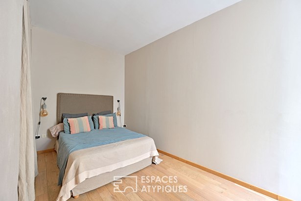 On the top floor, it reveals a bright and warm living room of over 40m2, a 12m2 bedroom with dressing room and a bathroom.