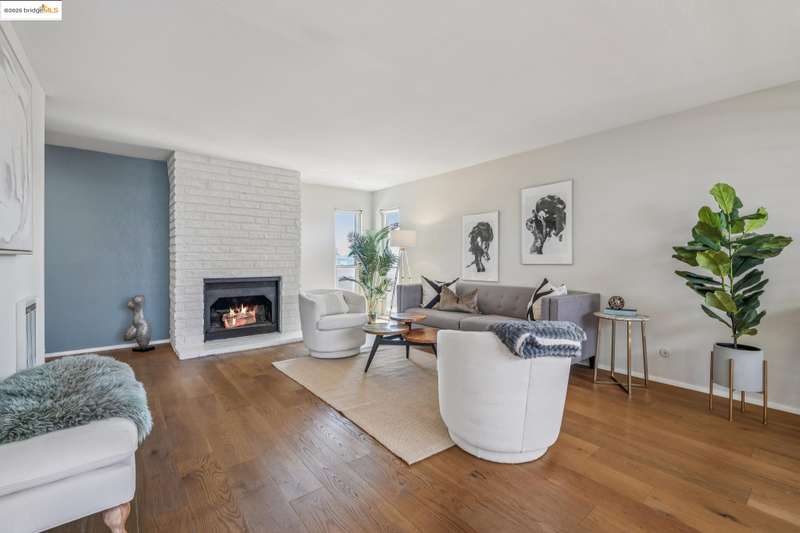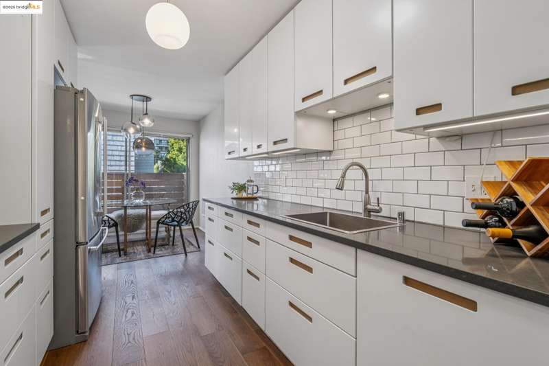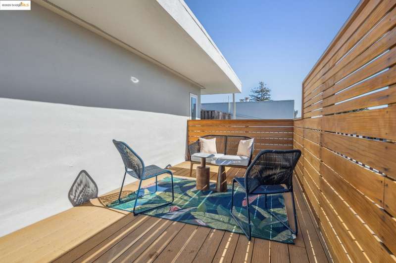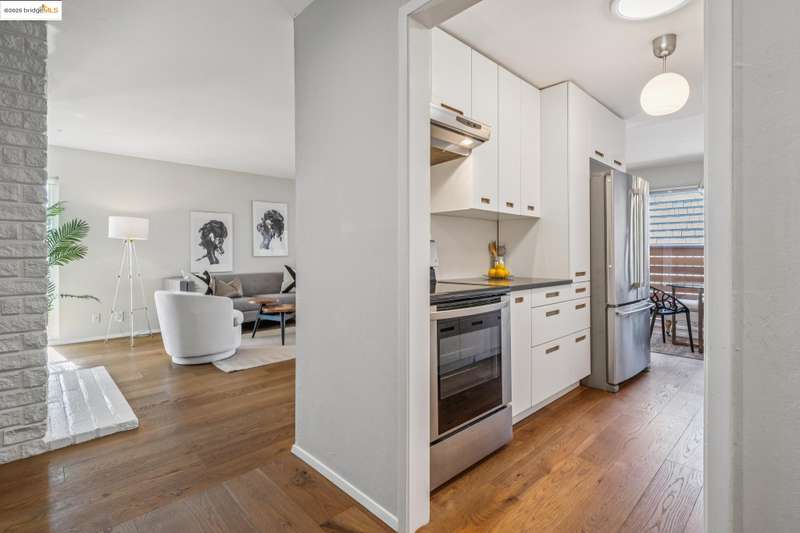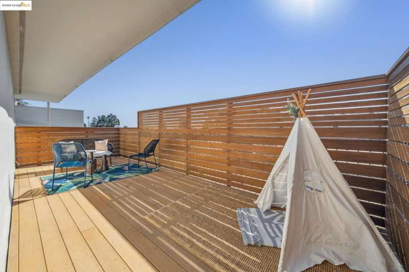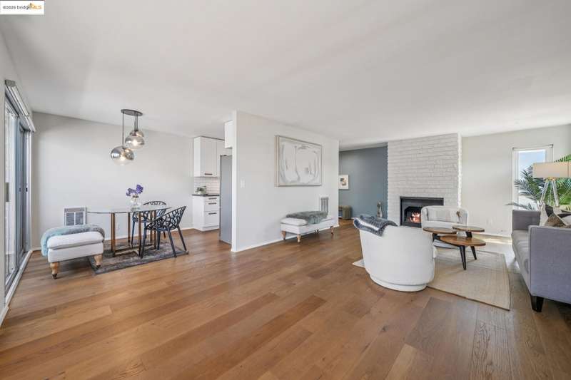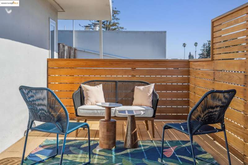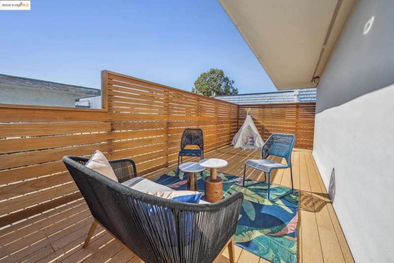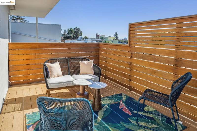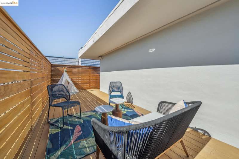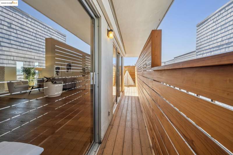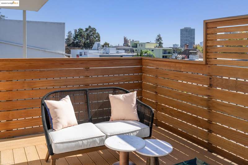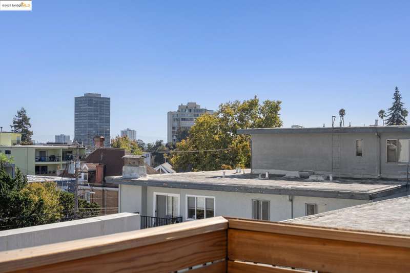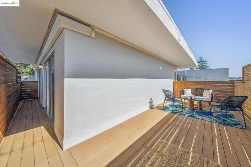 Welcome to the Penthouse. This refined residence offers an exceptional blend of sophisticated design, expansive living spaces, and modern finishes, all just blocks from Lake Merritt. Thoughtfully remodeled, the kitchen pairs sleek modern updates with the timeless warmth of natural oak floors that flow throughout the home. The generous living room, complete with a charming brick fireplace, creates a welcoming centerpiece. An elegant dining area, accented by striking modern lighting, provides the perfect setting for gatherings large or small. The crown jewel of this home is its expansive penthouse rooftop deck, encircled by a custom redwood fence that ensures both privacy and style; an ideal space for al fresco entertaining, while taking in neighborhood views. The oversized primary bedroom is equipped with an en-suite half-bath and a walk-in closet. Additionally, the oversized second bedroom boasts multiple double slider closets. Both bathrooms feature modern vanities, lighting, and mirrors. Skylights throughout bathe this penthouse unit in abundant natural light. Convenience is woven into the design, with additional ample closets off the foyer for organized storage. Close to all the restaurants and shops along Grand and Lakeshore. Blocks from Whole Foods and access to nearby I-580.