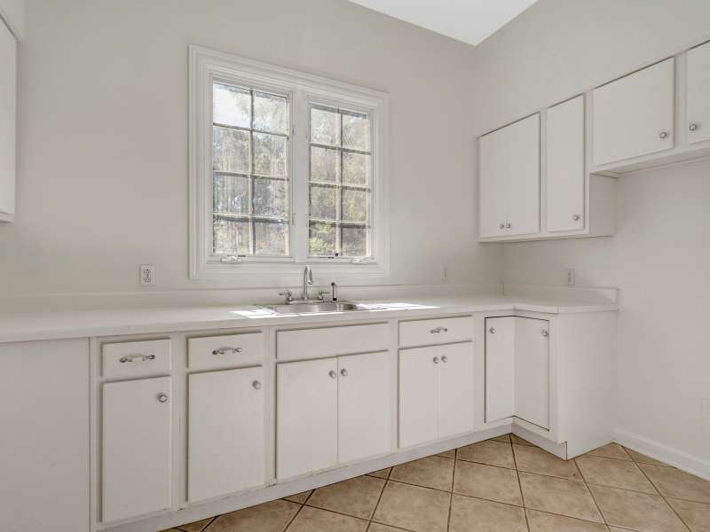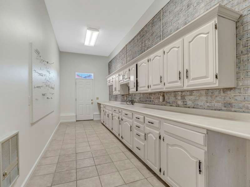 A well-appointed laundry room offers built-in cabinets, sink, and space for an additional refrigerator with an ice maker.