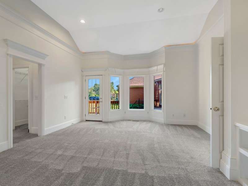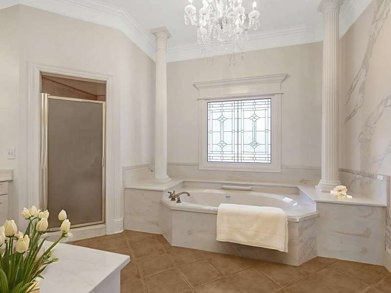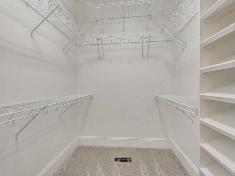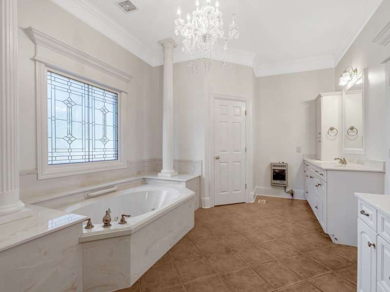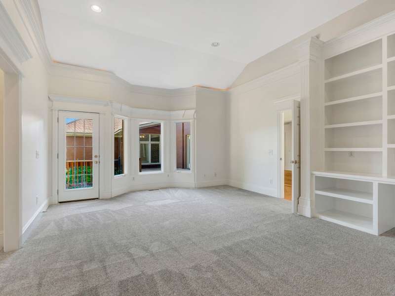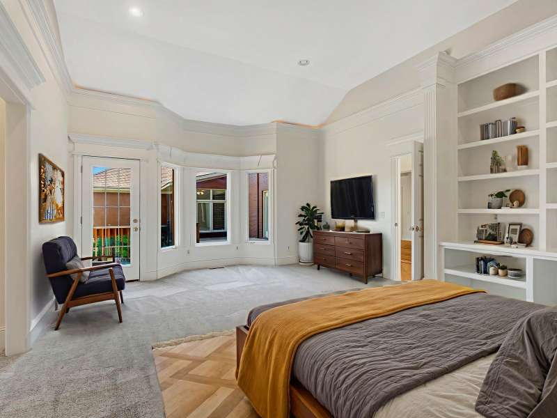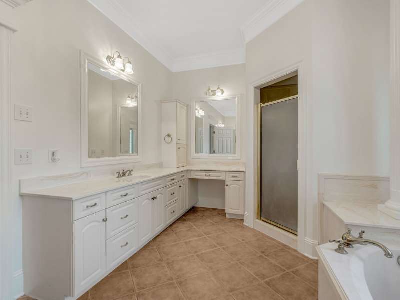 The owner's suite is a true retreat, featuring built-in bookshelves, a luxurious spa bath with double vanities, custom marble shower, and a sunken soaking tub. Dual custom closets with built-in shelving provide ample storage and organization.