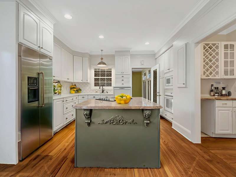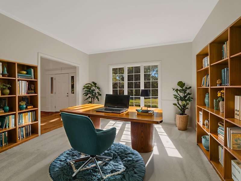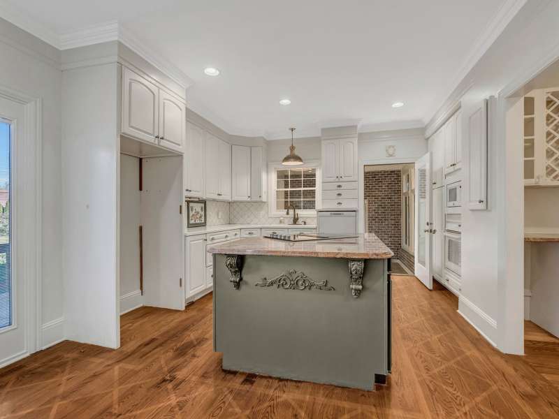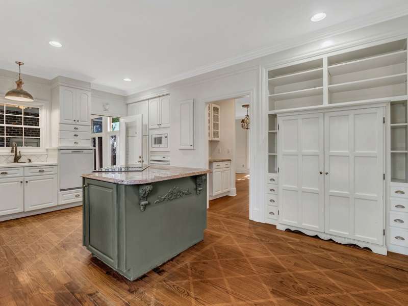 The gourmet kitchen showcases custom cabinetry with built-in shelving, a wall oven and microwave, trash compactor, and plenty of workspace for the home chef. The home office and cathedral ceilings add both functionality and grandeur.