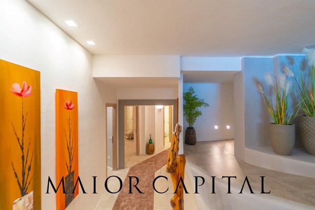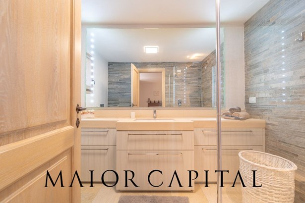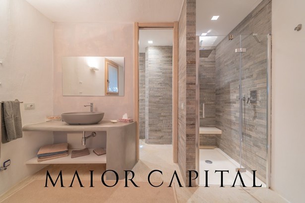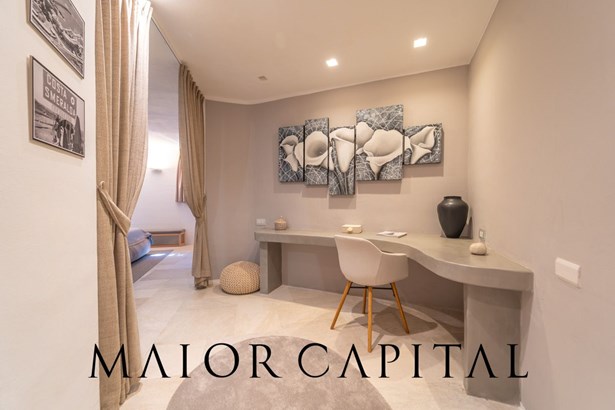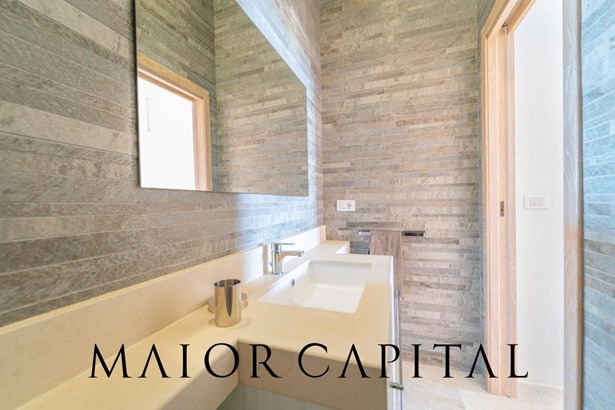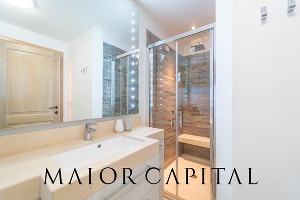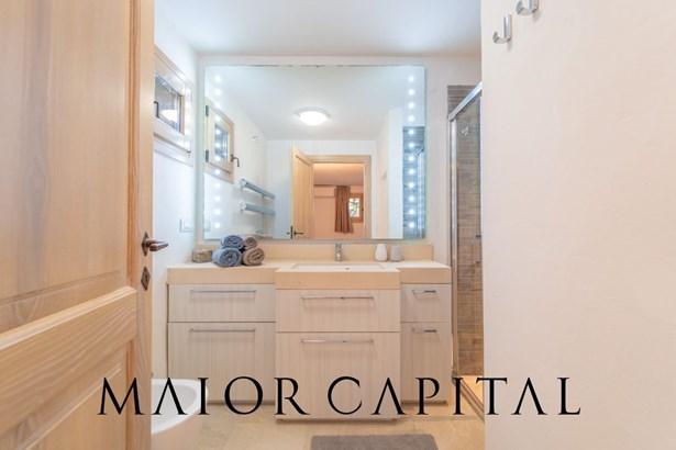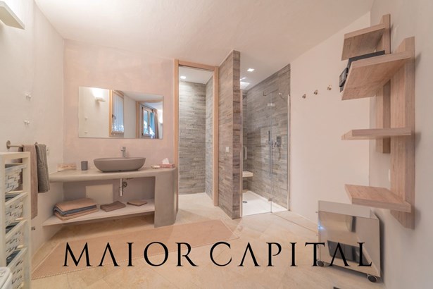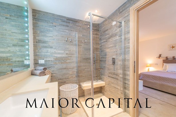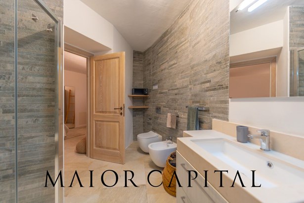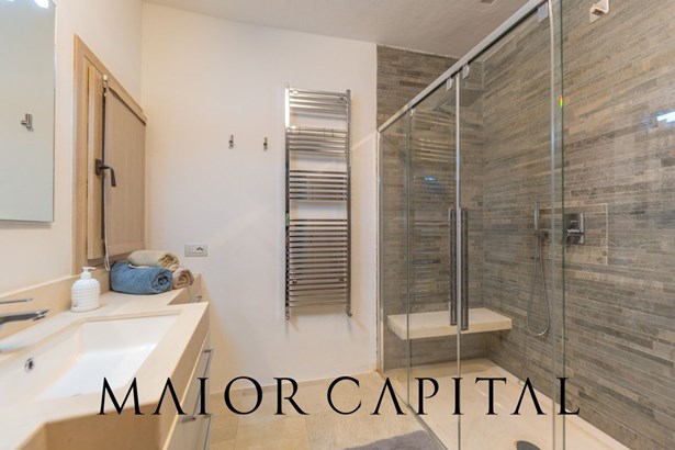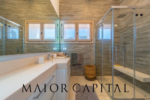The lower floor, also accessible via an independent entrance, is designed to offer maximum versatility and hospitality. A second spacious living area can be transformed into a private cinema room, ideal for family evenings or entertaining guests in comfort. The sleeping area consists of four bedrooms, each with its own private bathroom, offering high-level accommodation in a private and quiet setting.