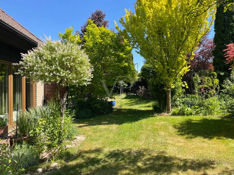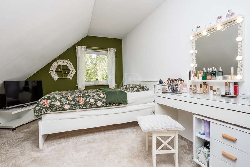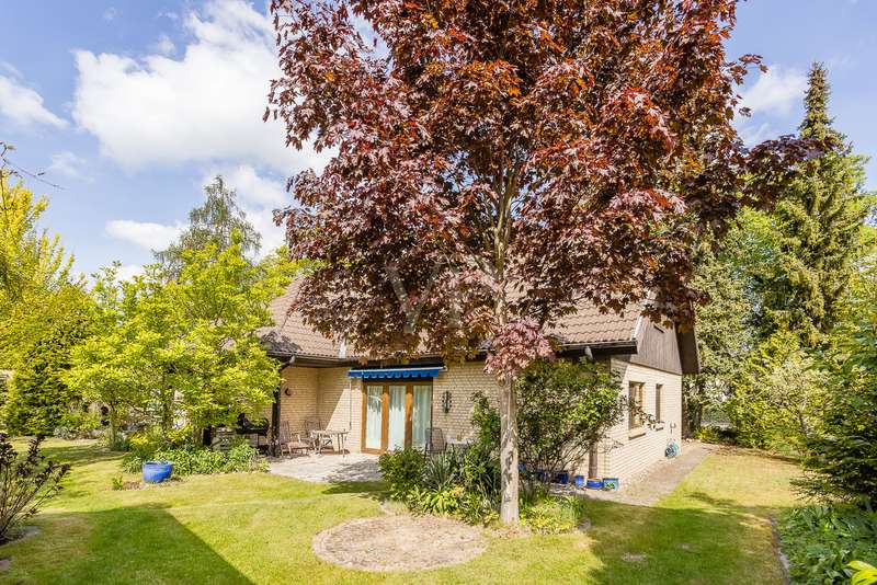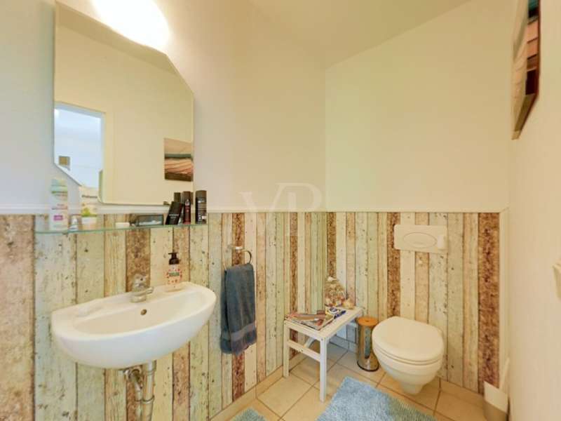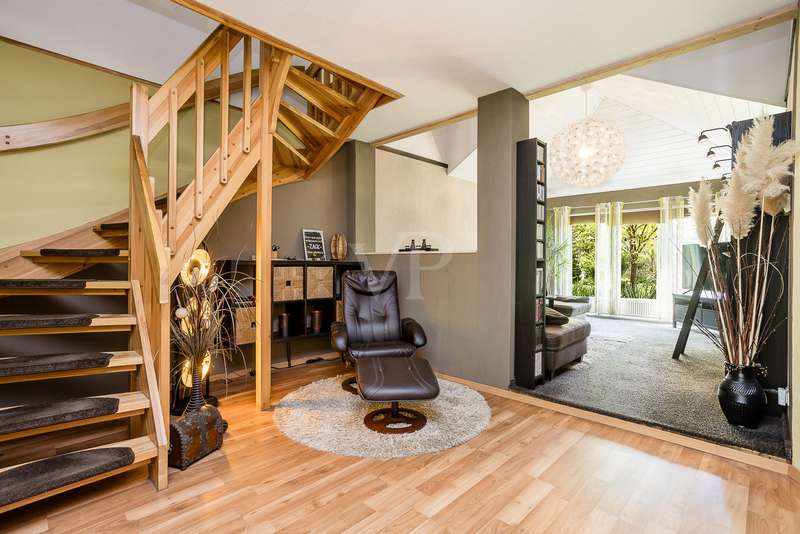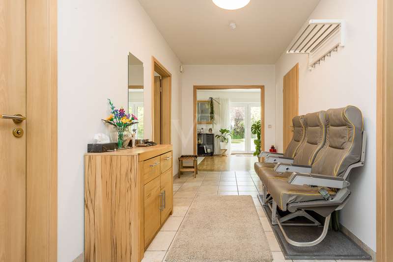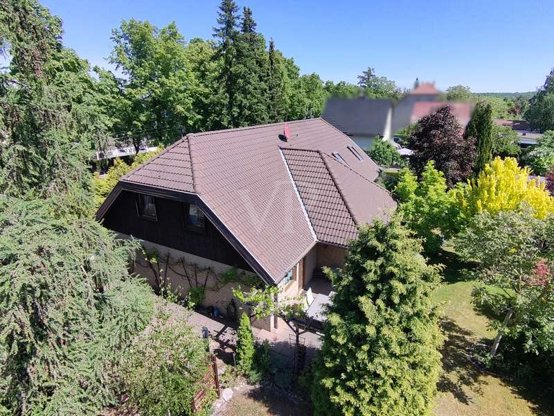 Built in 2004, this fully brick-built detached house with granny apartment combines well thought-out architecture, spacious living areas and a lovingly landscaped garden to create a harmonious overall picture. Situated on a plot of approx. 997 m², the property offers around 254 m² of living space, spread over a total of eight rooms - ideal for families, multi-generational living or a combination of living and working under one roof. An inviting hallway welcomes you as soon as you enter the house. There is a guest WC to the left and a practical utility room to the right. Straight ahead is a bright hallway from which you reach the spacious kitchen with access to the terrace - the perfect place for sociable evenings and relaxing hours outdoors. Also directly accessible from the hallway is the friendly living room, which impresses with its spaciousness and beautiful view of the garden. A special architectural highlight is the beautiful cathedral ceiling in the living room of the main house. The upper floor of the main apartment welcomes you with an open gallery that conveys an airy feeling of space. Here you will find a stylish bathroom with shower and bathtub, a dressing room and two rooms that can be used flexibly - ideal as bedrooms, children's rooms or studies. The separately accessible granny apartment impresses with its spaciousness and successful room layout. You enter the living area via a separate hallway, which comprises a spacious living and dining room in addition to a study and a modern shower room. This can be divided into two practical rooms if required. The adjoining kitchen is fully equipped and can be accessed both from the living room and directly from the hallway. A special highlight of the granny apartment is the converted attic. Here you will find a large studio with several rooms: a bedroom with an adjoining small room, another room with a dressing room and a separate WC. Whether as a retreat for guests, space for older children or for creative use - this area offers a wide range of possibilities. The outdoor area impressively rounds off the offer. The well-tended garden with two separate terraces - one for the main apartment and one for the granny apartment - invites you to linger. The awnings above both terraces provide protection from the sun and cozy hours outdoors. Additional storage space is provided by a solid workshop in solid construction with two rooms, while the carport offers space for two vehicles. An electrically operated gate provides convenient access to the carport. Each residential unit has a 6,000-liter rainwater tank that can be used for watering the garden. Conclusion: This spacious and well-kept house offers space for individual living concepts and impresses with its high quality of living, functional architecture and charming garden - an ideal home with many possibilities.