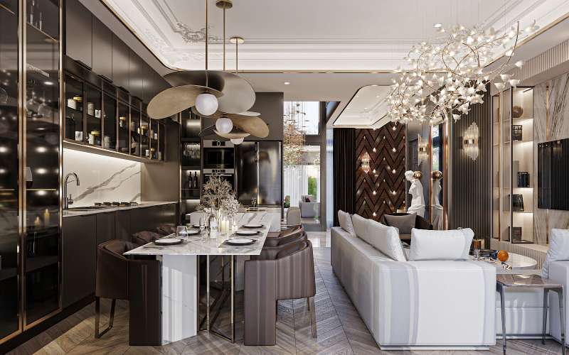 Sea view triplex houses have high-quality flooring, lighting, balcony and stair railings, shower cabins, bathroom and kitchen cabinets, electricity, heat, and water installations, and underfloor heating systems in the bathrooms.