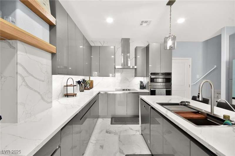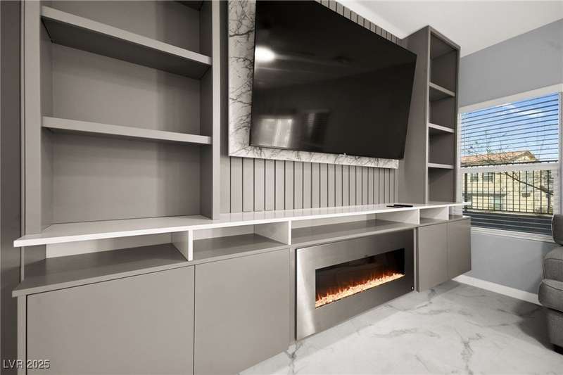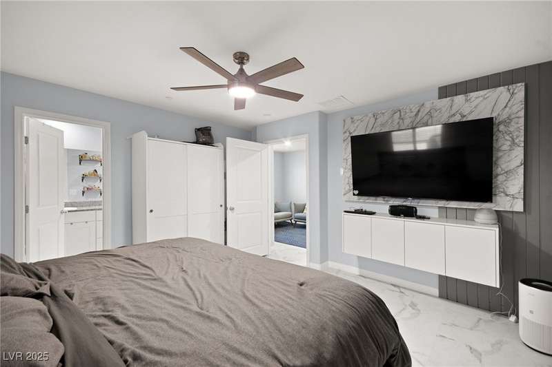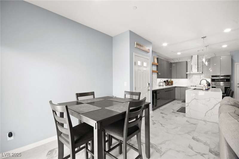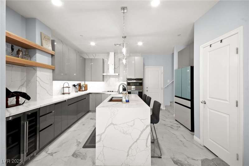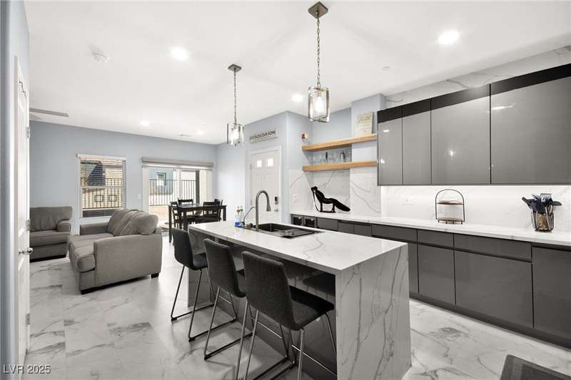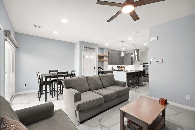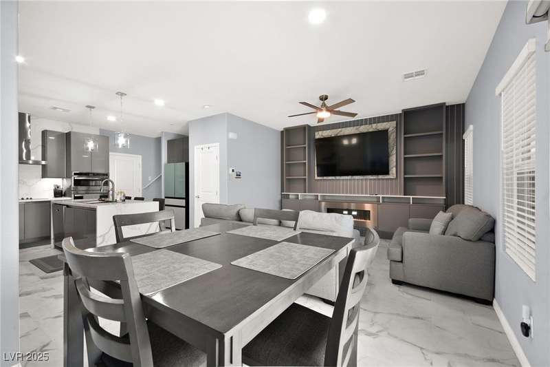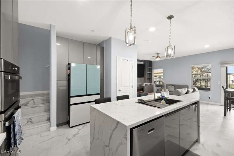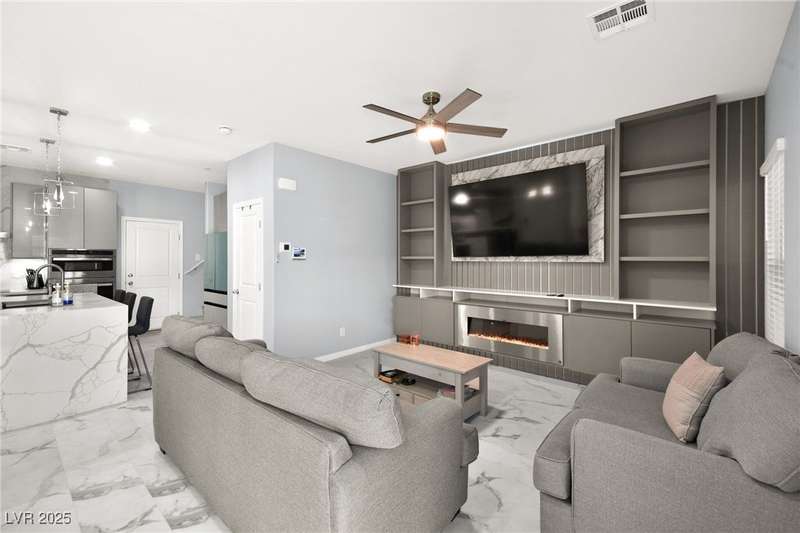 A masterfully upgraded and transformed 3 bed, 2 bath townhome. The luxury kitchen includes all new appliances and range hood, custom cabinetry with pullout drawers and a spice rack, a drink fridge, a luxury sink with a glass cleaner and a specific fruit/vegetable washer, quartz countertops with a waterfall edge and a matching quartz backsplash. The living room features a custom built-in entertainment center with shelving, storage and LED lighting. The primary bedroom includes an LED backlit accent wall behind the TV. Enjoy ceiling fans throughout, including in the living room and each bedroom. All flooring has been upgraded to a tile-like LVP. There’s no carpet at all in the home. The loft has recently been turned into a home office with built-in desks and storage. The two-car garage features storage racks, a water softener and a tankless water heater. Other upgrades include a motorized shade over the downstairs sliding door, a reverse osmosis system and a walk-in pantry.