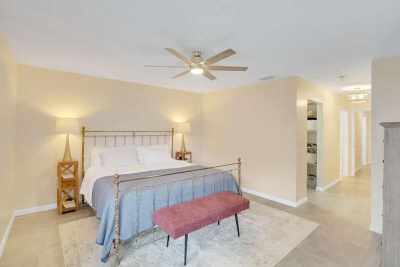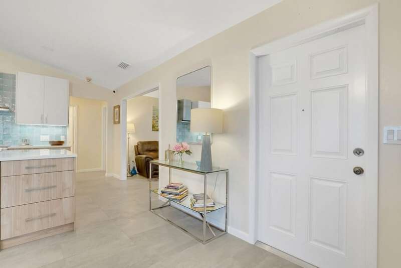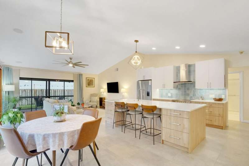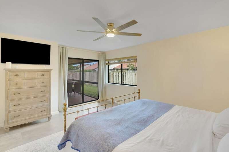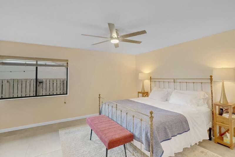 Newly remodeled family room with ample windows and views of the garden. Volume ceilings, custom lighting, kitchen island, conduction range, screened patio with outdoor seating. Bonus room: office/den. Plenty of closet space. Fully fenced garden with ample parking in a quiet Cul de Sac. Rainberry Lake is 3 miles from the beach and close to popular Atlantic Ave. Pool, tennis courts, pickle ball, basketball courts and gated community. Water and internet included.
