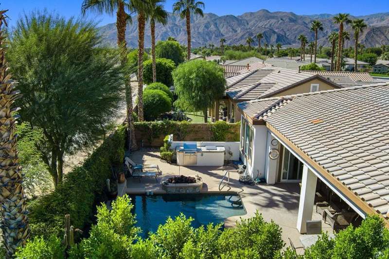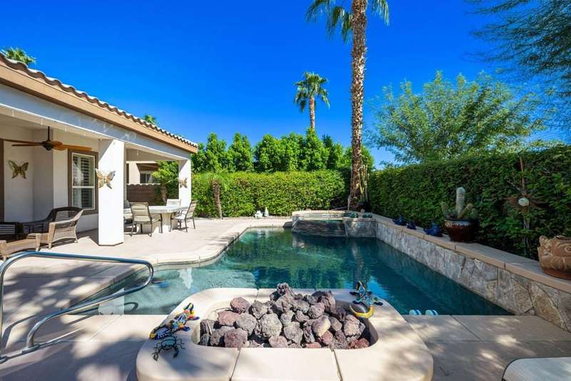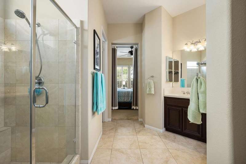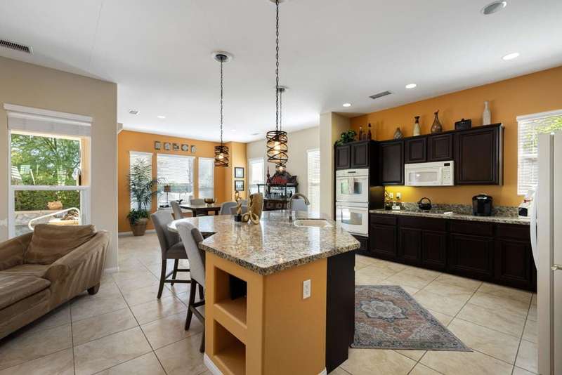 This beautifully maintained Caspian model with custom casita showcases thoughtful upgrades and exceptional livability, featuring a private mini-split A/C system and elegant wainscoting for guest comfort and privacy. Offering 3 bedrooms, 3 bathrooms, plus a versatile den/office that can serve as a 4th bedroom, this sought-after floor plan spans 2,060 sq. ft. of refined living space with soaring 10-foot ceilings throughout. The expansive great room highlights open concept living with a TV/media niche, dining area, and seamless views of the pool and patio. A chef's dream kitchen is appointed with rich espresso cabinetry, granite countertops, a generous prep island with bar seating and pendant lighting, built-in double ovens, microwave, dishwasher, and a spacious pantry. The primary suite retreat is complete with plantation shutters and a spa-inspired en suite bath boasting dual sinks and travertine finishes. Designed for resort-style living, the backyard is a true entertainer's paradise with a pebble tec spa cascading into the sparkling pool, cozy fire pit, private BBQ station, and a covered patio with built-in misters for year-round enjoyment. Make an appointment today for a closer look at this gem.