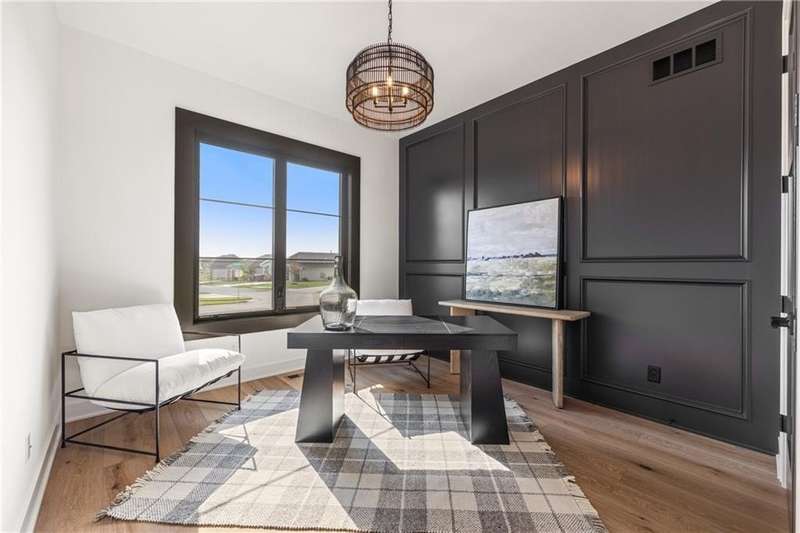 Introducing Lot 27 in Woodmyre—a sophisticated 1.5-story residence by award-winning JFE Construction. The Maplewood III Modern blends architectural drama with modern livability, beginning with a sweeping staircase. A private office off the entry creates a quiet workspace, complemented by a well-appointed full bath. The great room is anchored by a soaring two-story fireplace, perfectly paired with a gourmet kitchen featuring a custom coffee bar and expansive walk-in pantry. Sunlight pours into the southern-exposure dining room, which opens to a covered deck for year-round enjoyment. The primary suite is a serene retreat with a vaulted ceiling and a spa-inspired ensuite. On the upper level, all secondary bedrooms extend from an airy catwalk and surround a spacious loft—ideal for studying, lounging, or gathering. Photos are of previous model. Taxes and room sizes are estimated.