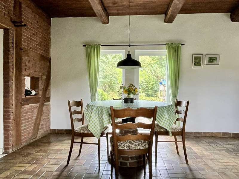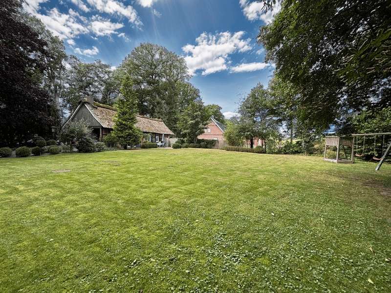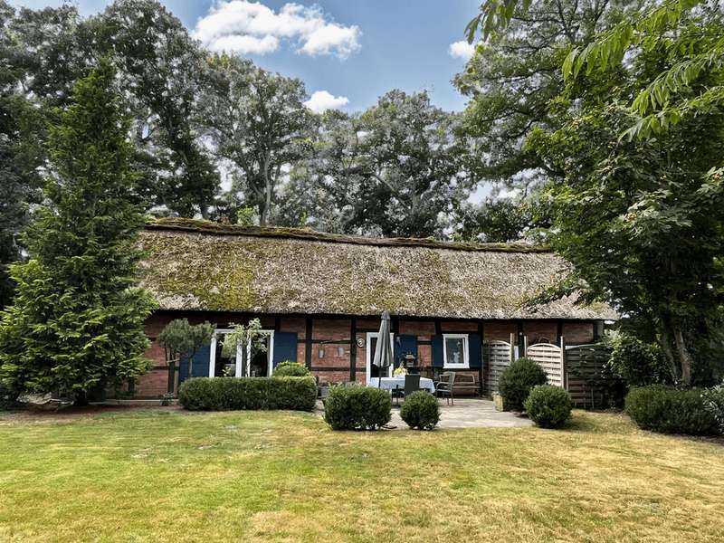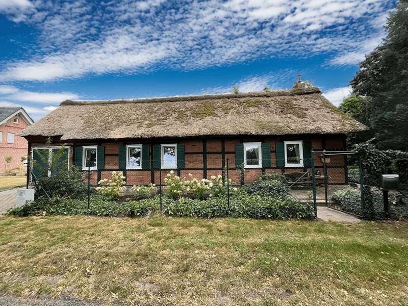 This idyllically situated weekend cottage awaits you in the quiet outskirts of Dinklage and is situated on a fully fenced plot of approx. 2,000 m². The lovingly landscaped garden with its own small wooded area offers a variety of uses - whether for horticultural development, for relaxing time-outs in the midst of nature or for sociable hours with family and friends. The interior of the thatched house is well-kept and impresses with its cozy living atmosphere. A total of 2.5 bedrooms are available - two fully-fledged bedrooms and a smaller room that can be used flexibly. The spacious living and dining area forms the heart of the house and is equipped with a brick fireplace, which provides pleasant warmth, especially in the colder months of the year. The space is complemented by a kitchen, a daylight bathroom with shower and a utility room with laundry room. If you are interested, we look forward to hearing from you, but would like to point out that the property can only be used as a vacation or weekend cottage and is not suitable for permanent residence! Please note: Some of the images shown contain AI-generated furnishings and are only intended to better illustrate the spatial effect. An energy certificate was not yet available at the time the advertisement was created.