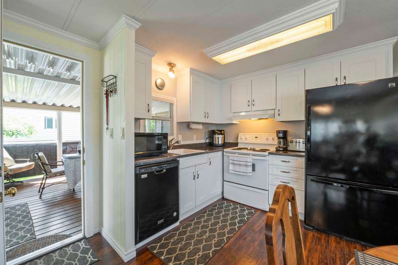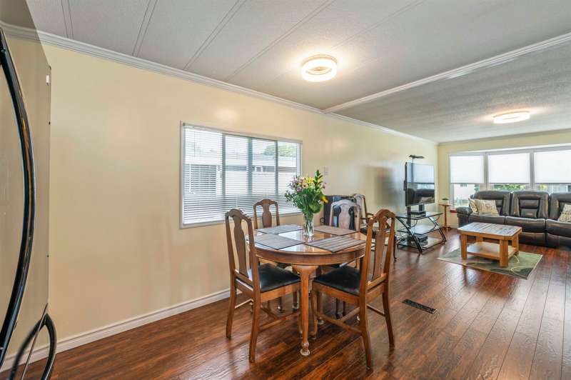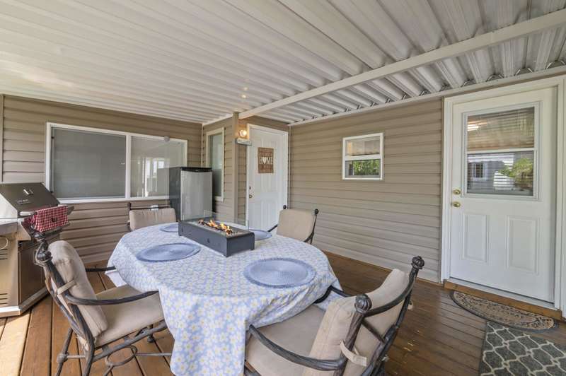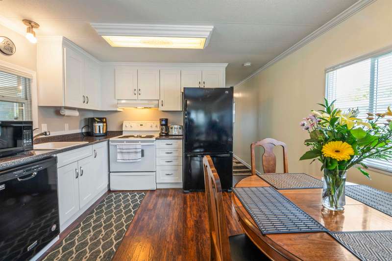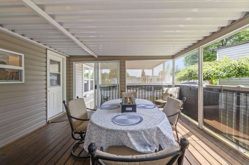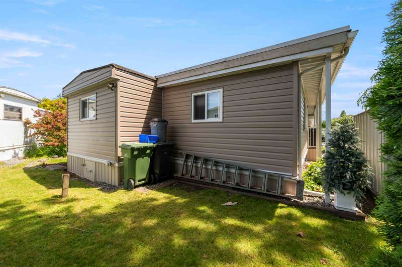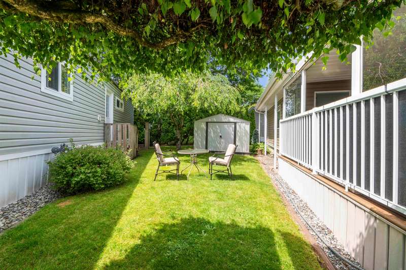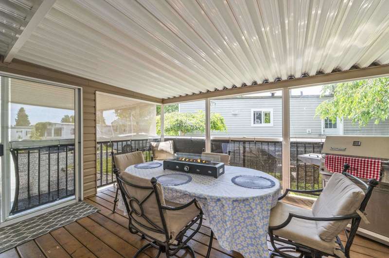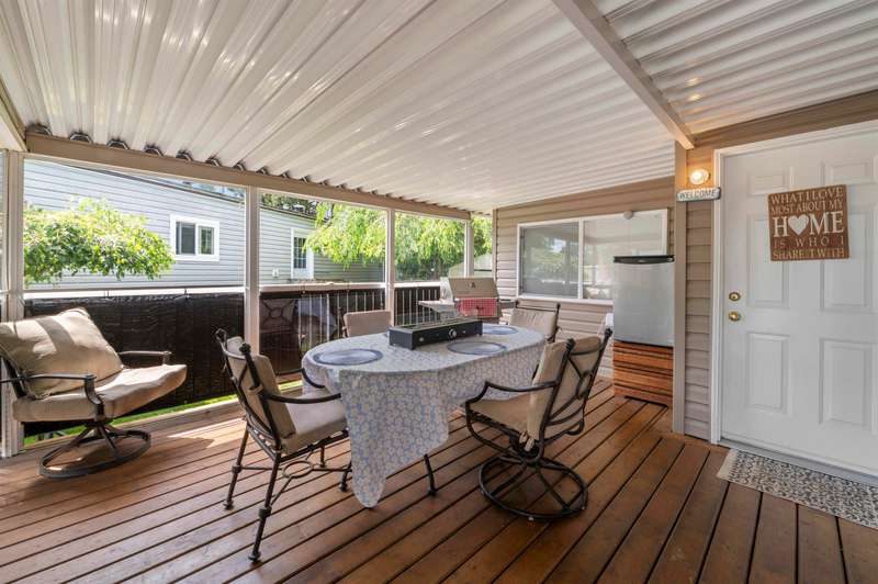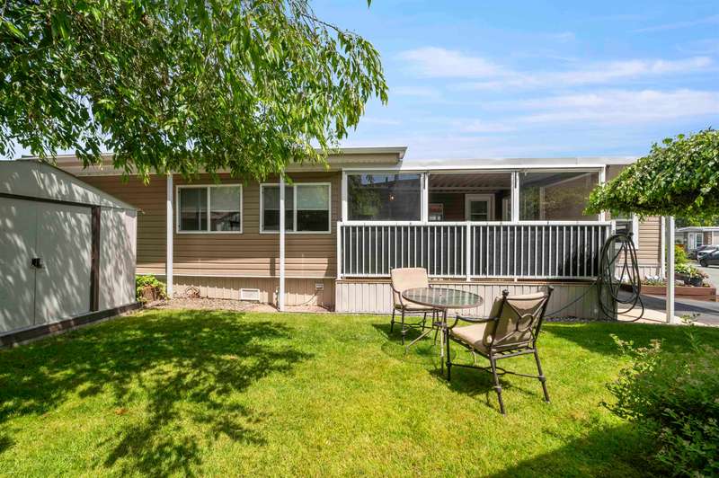 Great spot in sought-after Breakaway Bays Park. Families or Retirees don’t miss out on this 3 bedroom, 1 bathroom, with all the main things taken care of! Thermo windows, drywalled interior with added insulation, new lighting, windows, new paint, vinyl siding, blinds, enclosed deck with amazing up/down plexiglass windows for a great outdoor living space (200 sq ft) summer or winter!. 8’ X 10” Shed, lovely yard, Pet-friendly (2 pets allowed: cat/dog), no age restrictions! Amenities include a clubhouse, amenity room, outdoor heated pool, and beautiful walking trails. Close to Highway 99, transit, shopping, the beach, hospital, schools - RV Storage Available. The perfect place to call “Home”! Electricity is included in the pad rent!