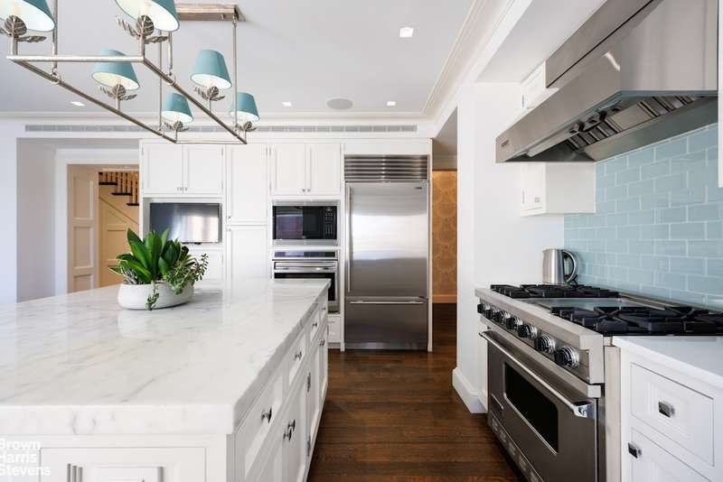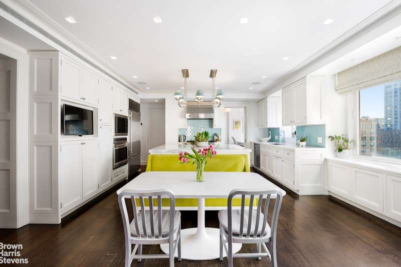 Enter on the 13th floor into a lovely gallery with lots of closet and storage space. The dramatic, oversized chef's eat-in kitchen has several windows, including a huge picture window with amazing views of the Hudson River. There is an extra-large Viking stove, 2 ovens, a double sink and lots of counter and cabinet space. There is also a large center island as well as a table for eating in. The adjacent office is big enough for 2 people to work, with the same amazing River view. Off the kitchen, towards the service entrance, is also a convenient laundry room with vented side by side washer/dryer and additional storage.The formal living room, formal dining room and an additional library/ fifth bedroom are also on this floor. All 3 rooms have open North views and the library/ fifth bedroom also has a West facing window with a River view.