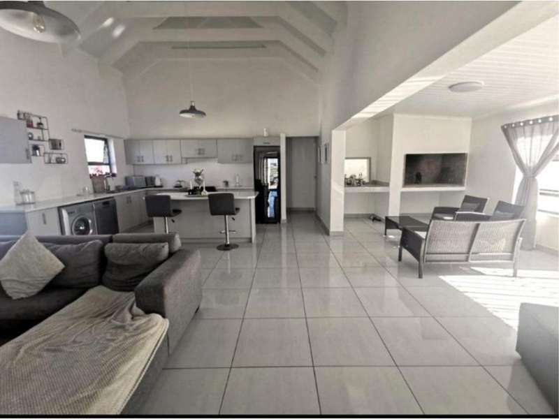 Modern 3 bedroom house for sale in Dolfynstrand in Dwarskersbos. Beautifully designed home that features an open plan lounge-dining-kitchen, and a braai room to the right. The master bedroom is separate with an en-suite bathroom. The other two rooms enjoy a family bathroom. The double automated garage enters in the foyer of the house. An enclosed back yard provides for pets and a safe playground. Call me to explore this unassuming property