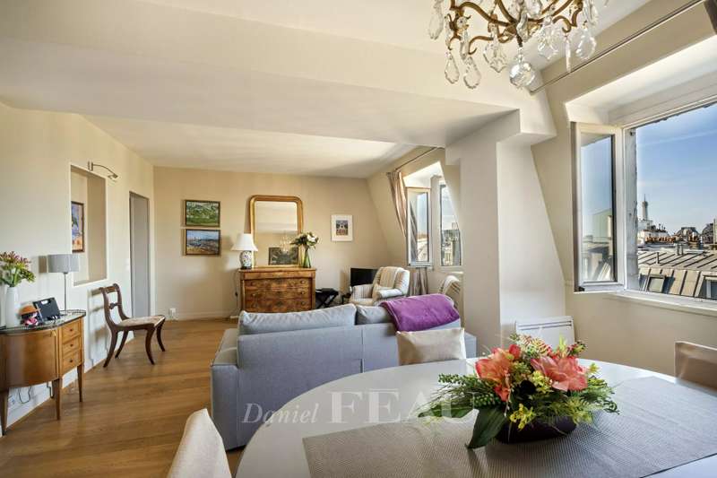Rue du Pont Neuf. This bright and peaceful dual-aspect apartment in perfect condition is on the 7th and top floor of a fine freestone building with a lift. 74 sqm of living space as defined by the Carrez Law includes a living/reception room, a dining room, a separate kitchen, two bedrooms and two shower rooms. An ideal pied a terre near the capital’s iconic Samaritaine department store.