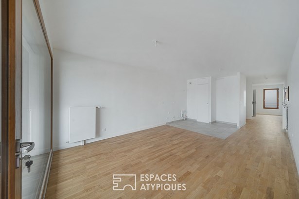 The modern architecture of the complex contrasts elegantly with the charm of the surrounding old facades. The rare asset of this property: a large opening to the outside via a sheltered loggia, a true extension of the living room and a veritable open stage on neighborhood life.