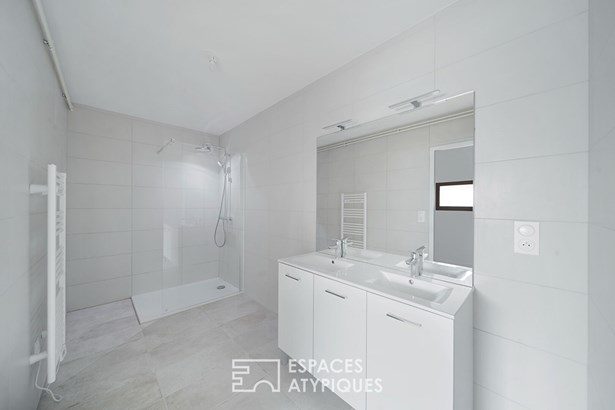 The entrance leads to a vast living space of nearly 27 sqm, bright and uncluttered, designed to accommodate an open kitchen. Three comfortable bedrooms, a large bathroom with double sinks, as well as a laundry area complete the ensemble.