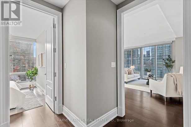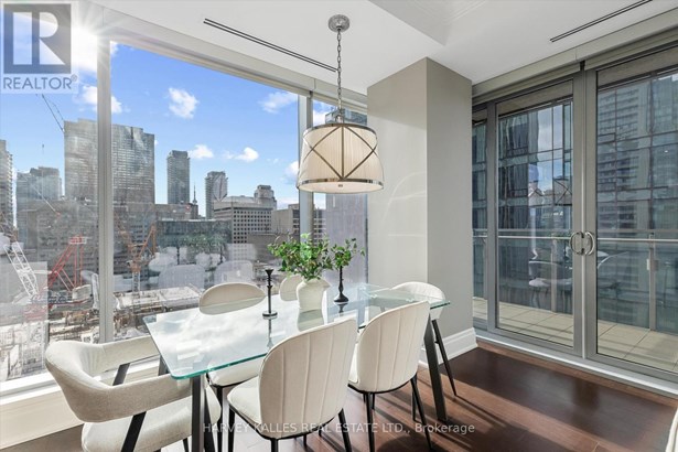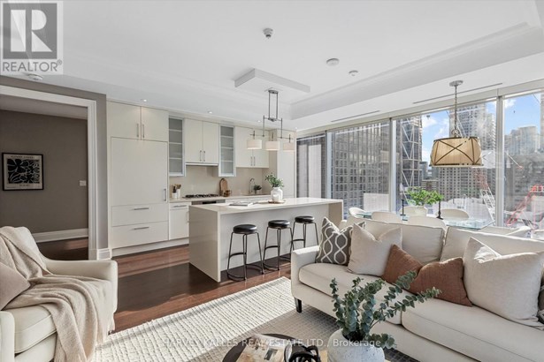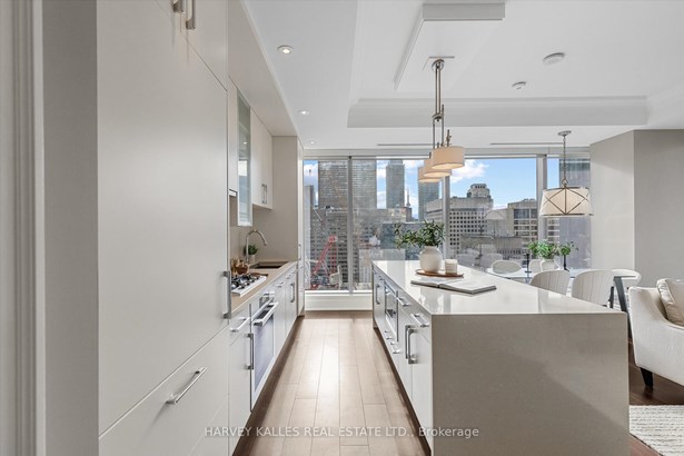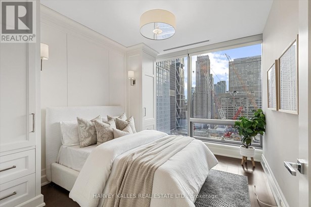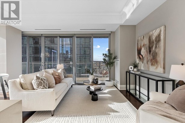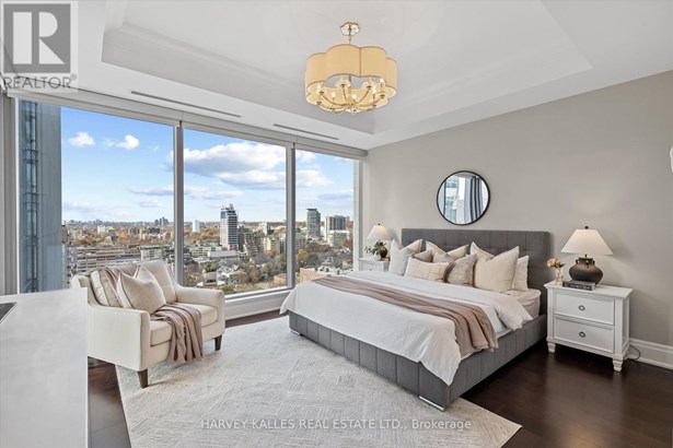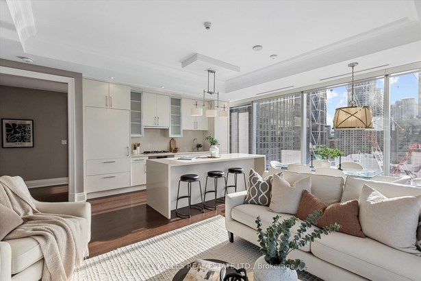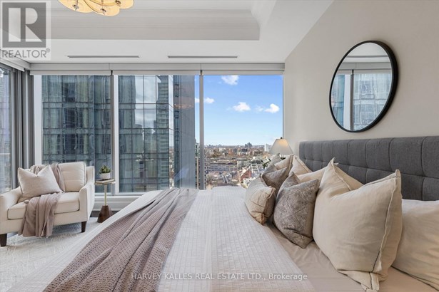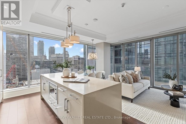 An emblem of refined living in one of Toronto's most prestigious locations, Suite 1805 at 55 Scollard stands within the iconic Four Seasons Private Residences. Here, architectural elegance, hotel-inspired service, and effortless sophistication converge in an extraordinary two-bed, two-bath home spanning approximately 1,265 sq.ft. From the moment you arrive, a sense of calm refinement takes hold. Expansive floor-to-ceiling windows flood the suite with natural light, highlighting clean lines, rich finishes, and a timeless modern aesthetic. The open-concept living and dining areas are designed for both intimate relaxation and stylish entertaining, all framed by sweeping south-west views of the Yorkville skyline. The chef's kitchen seamlessly blends form and function with integrated Miele, Sub-Zero, and Panasonic appliances, a gas range, polished granite surfaces, and abundant cabinetry, perfect for casual mornings or elegant evenings in. Enjoy your coffee at the granite waterfall island, thoughtfully designed with additional storage and generous bar seating. The primary suite is a serene retreat featuring a spa-inspired five-piece ensuite with a deep soaking tub, glass shower, double vanity, and refined marble finishes. A custom walk-in closet with sleek built-ins and a pocket door elevates both style and practicality. The second bedroom offers versatile space for guests, work, or leisure. Residents enjoy exclusive access to a curated selection of amenities and full hotel privileges: 24-hour concierge and valet, a world-class fitness centre, indoor pool, and direct connection to the Four Seasons Spa. Steps from Yorkville's premier boutiques, acclaimed dining, and parks, this address delivers the ultimate balance of luxury and convenience. Extras include: one owned parking space and locker, ensuite laundry in the primary suite, automatic roller blinds throughout, and more. A truly exceptional opportunity to own within Toronto's most iconic residence.