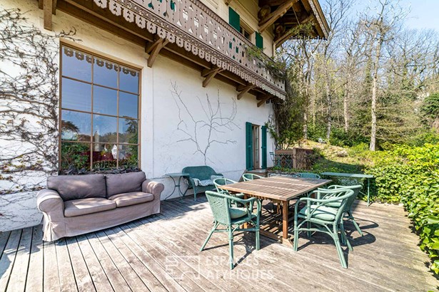 Nestled on the heights of Saint Prix, this exceptional chalet dating from 1850 offers a breathtaking panoramic view of Paris. Located in the heart of the picturesque village of old Saint Prix, it extends over a vast plot of 2500 sqm, bordered by the national forest, thus creating a true natural setting. As soon as you enter, you will be charmed by a majestic hall decorated with a staircase with a unique character, which leads you to nearly 400 m2 of charming living spaces.