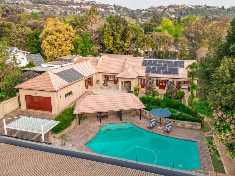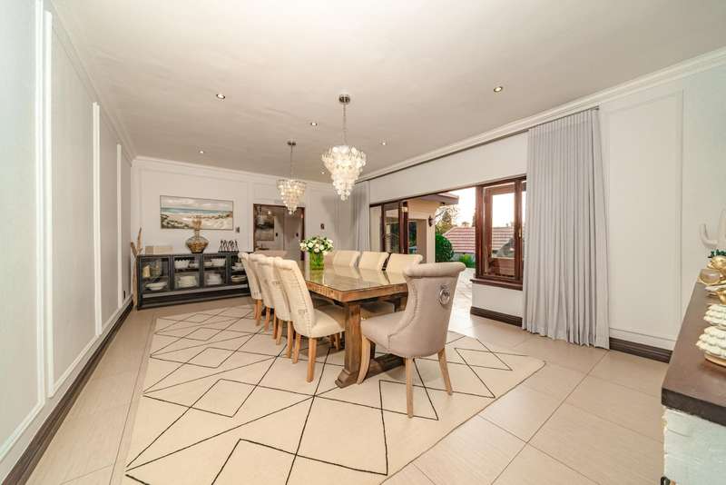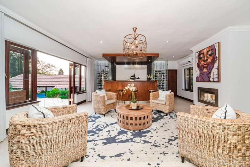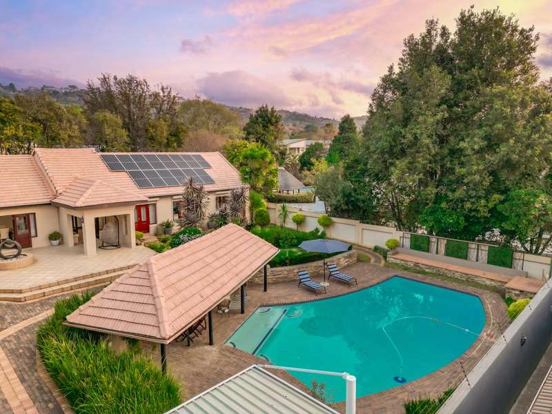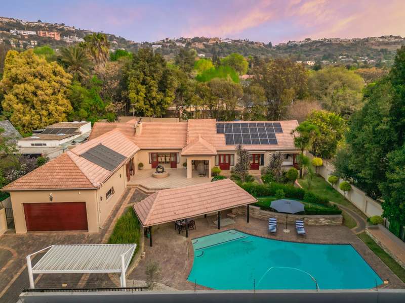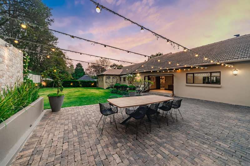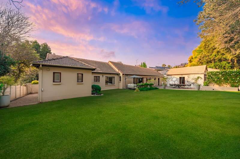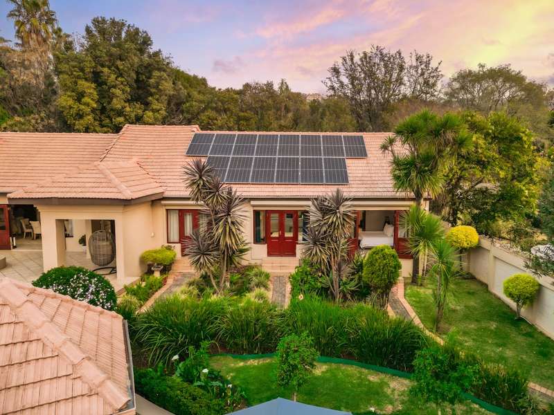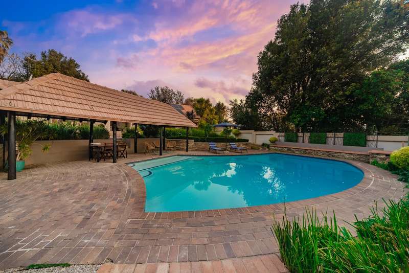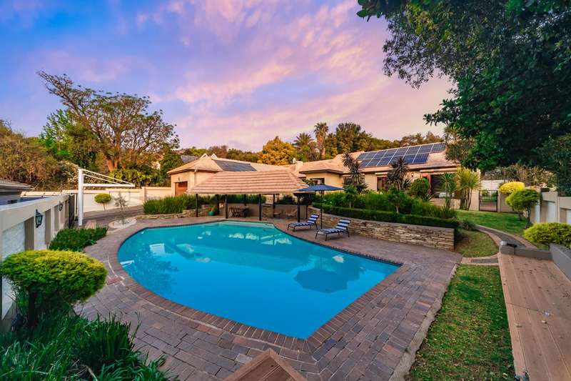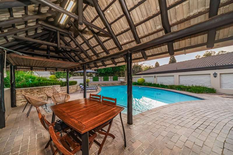 Welcome to a beautifully renovated family residence where timeless charm meets modern convenience. Spanning an impressive 375sqm under roof, this four-bedroom, three-bathroom home has been meticulously maintained by the same family for over 20 years and is now offered in pristine condition. The interiors flow seamlessly from the sleek designer kitchen, equipped with premium finishes, into multiple living spaces including a stylish lounge, an elegant dining room, and an inviting entertainment lounge with a statement wine-rack feature and bar. Enhancing the atmosphere are two fireplaces?Çöone gas and one wood-burning?Çöthat create warmth and character, while security shutters on all bedroom doors offer peace of mind without compromising style. Outdoors, the property is designed for a lifestyle of leisure and celebration. A covered entertainment terrace overlooks the sparkling swimming pool, perfect for alfresco dining and summer gatherings, while the landscaped gardens are complemented by a borehole and a robust solar system for sustainable living. Additional features include double garages, a single carport, and staff accommodation, making this home as functional as it is luxurious. Every detail?Çöfrom the sparkling poolside retreat to the refined interiors?Çöhas been crafted to deliver the ultimate in family living, entertainment, and long-term comfort.