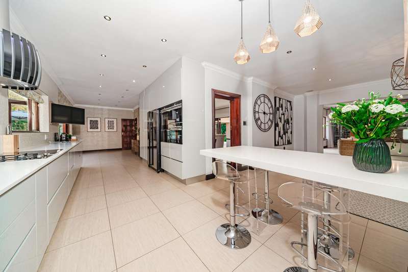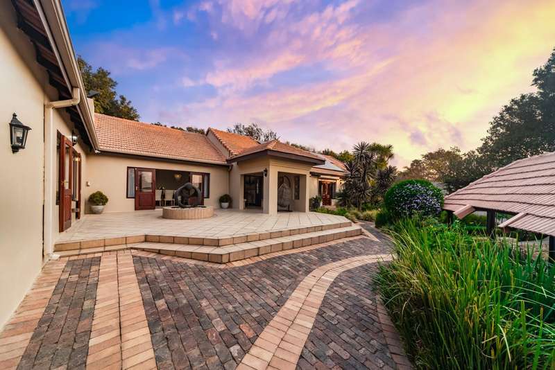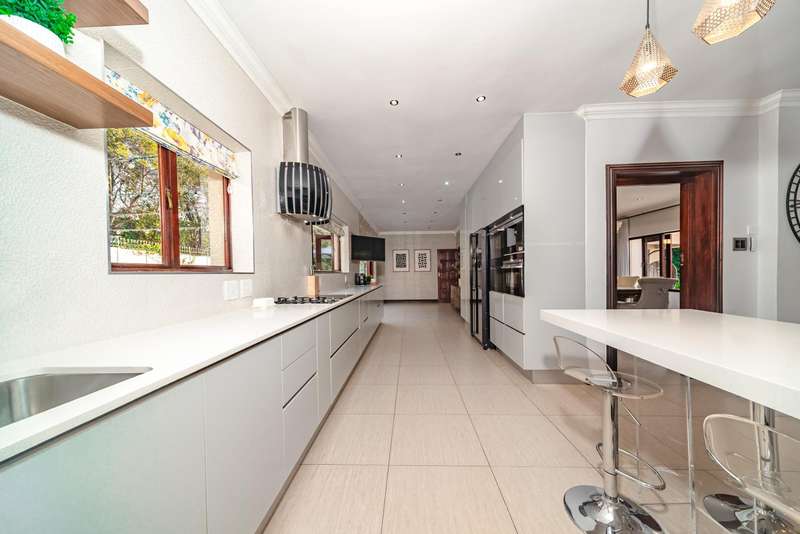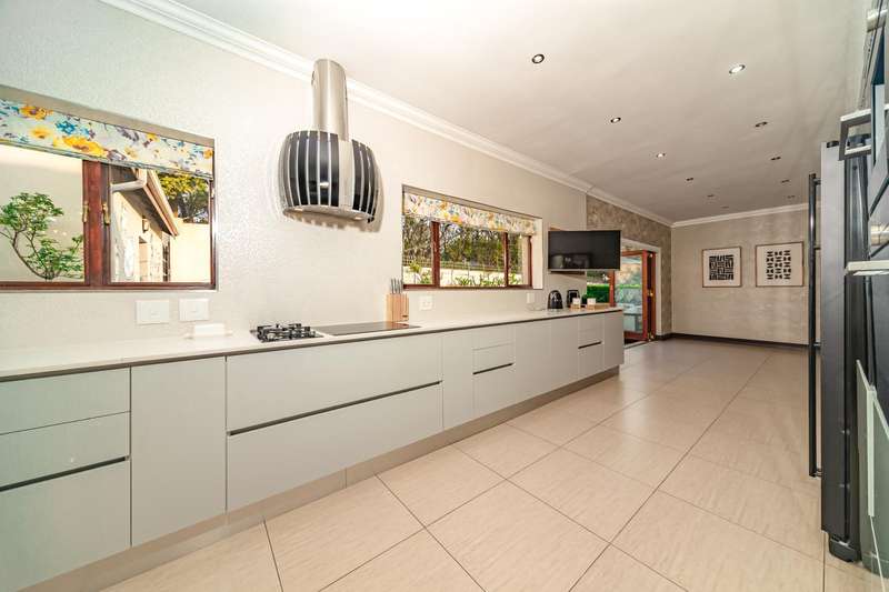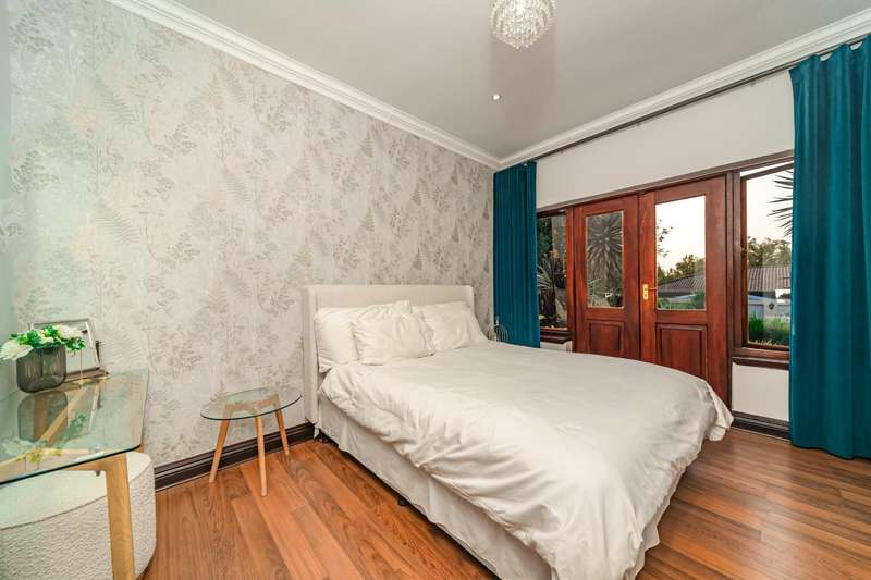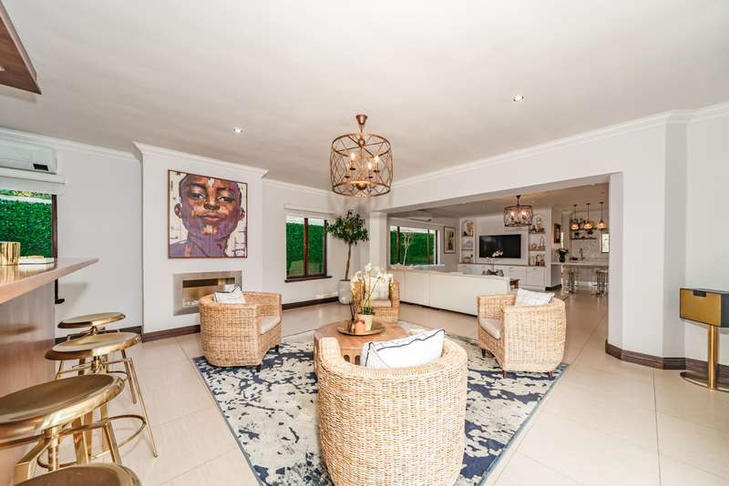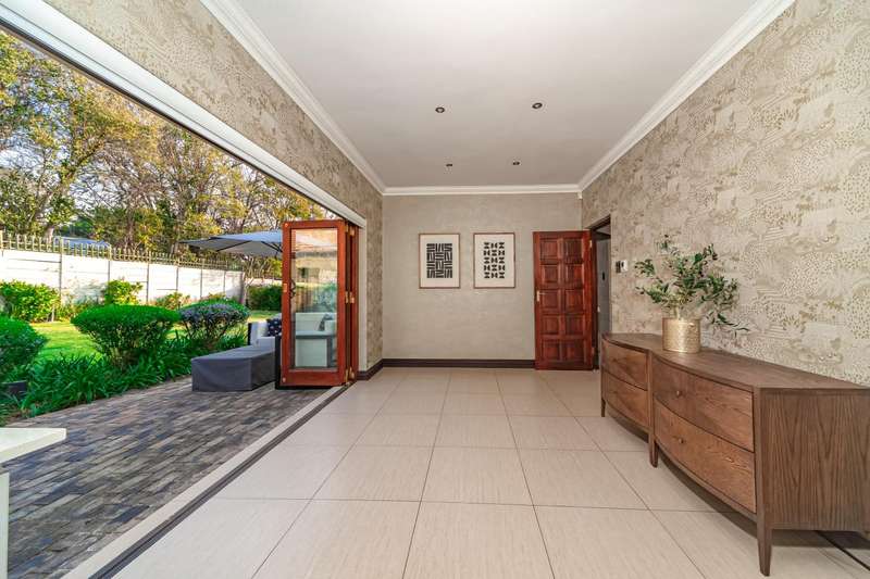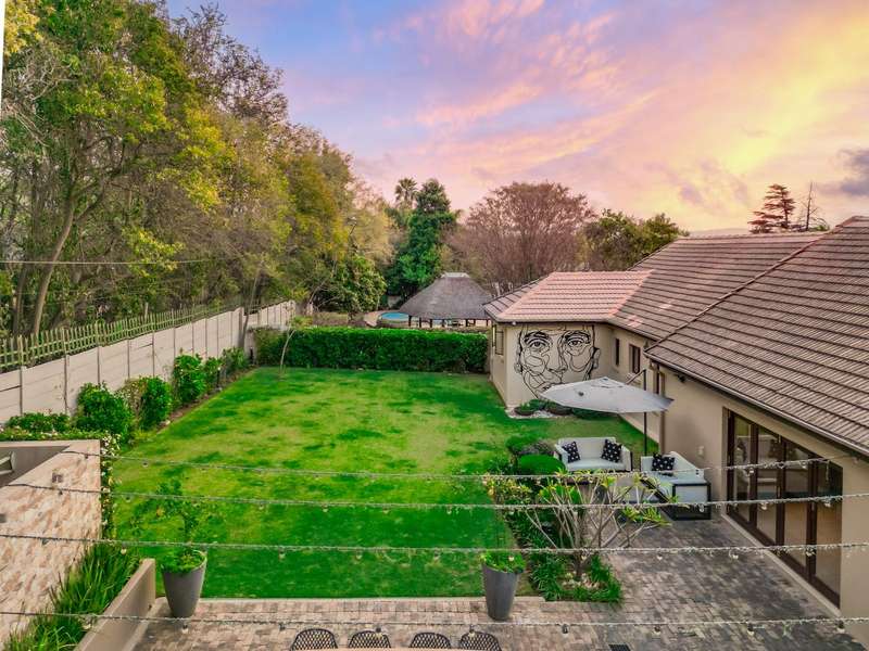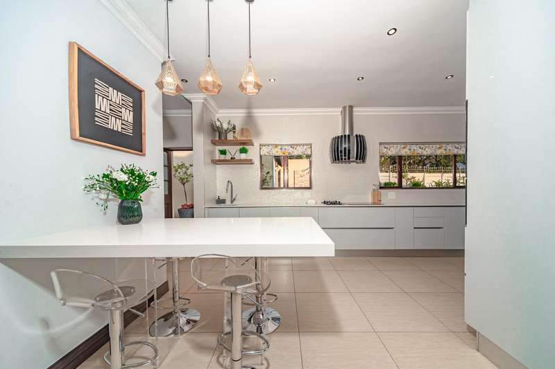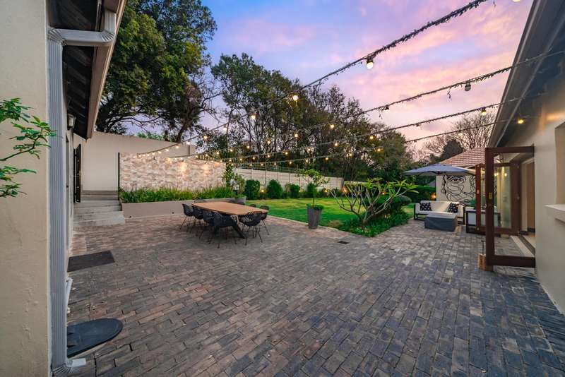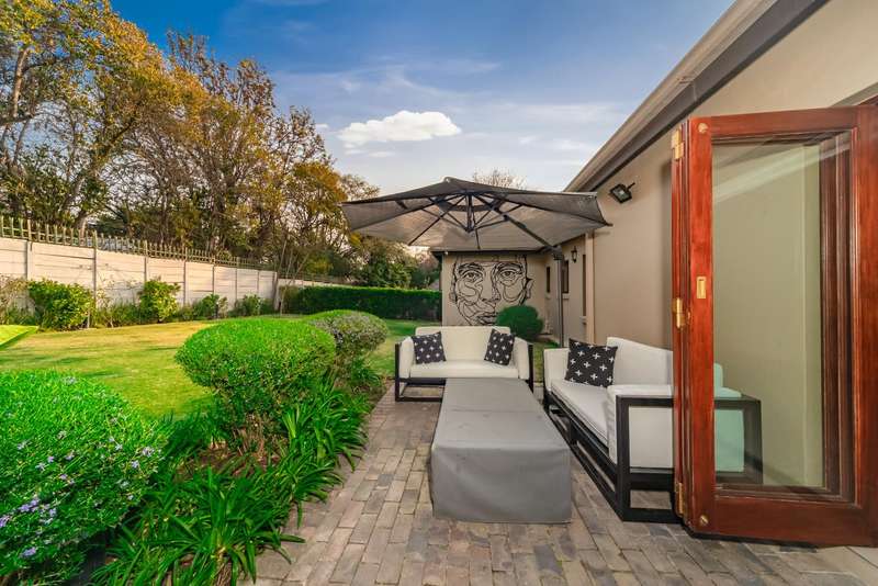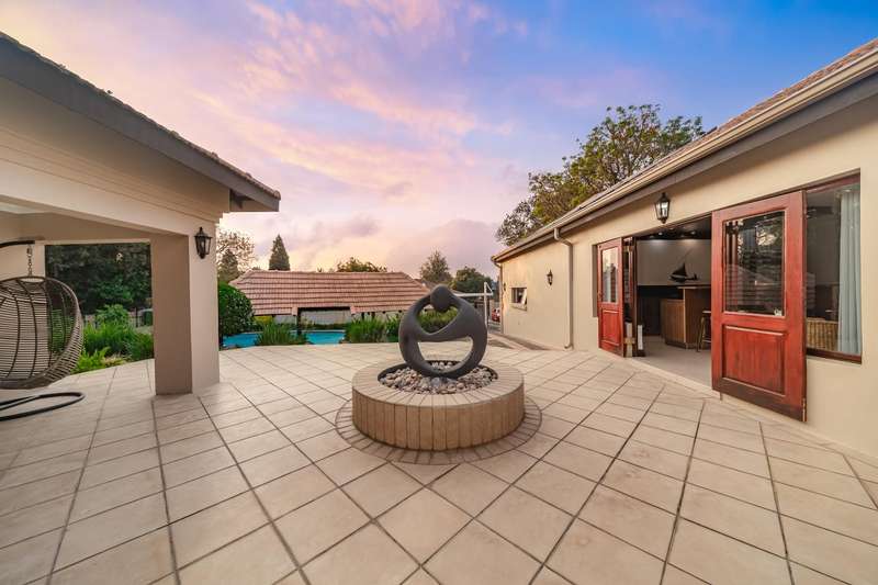 Welcome to a beautifully renovated family residence where timeless charm meets modern convenience. Spanning an impressive 375sqm under roof, this four-bedroom, three-bathroom home has been meticulously maintained by the same family for over 20 years and is now offered in pristine condition. The interiors flow seamlessly from the sleek designer kitchen, equipped with premium finishes, into multiple living spaces including a stylish lounge, an elegant dining room, and an inviting entertainment lounge with a statement wine-rack feature and bar. Enhancing the atmosphere are two fireplaces?Çöone gas and one wood-burning?Çöthat create warmth and character, while security shutters on all bedroom doors offer peace of mind without compromising style. Outdoors, the property is designed for a lifestyle of leisure and celebration. A covered entertainment terrace overlooks the sparkling swimming pool, perfect for alfresco dining and summer gatherings, while the landscaped gardens are complemented by a borehole and a robust solar system for sustainable living. Additional features include double garages, a single carport, and staff accommodation, making this home as functional as it is luxurious. Every detail?Çöfrom the sparkling poolside retreat to the refined interiors?Çöhas been crafted to deliver the ultimate in family living, entertainment, and long-term comfort.