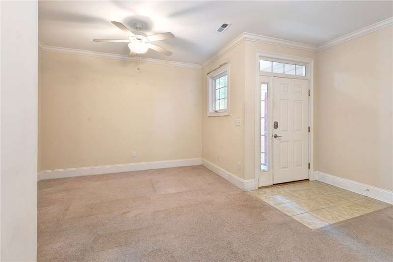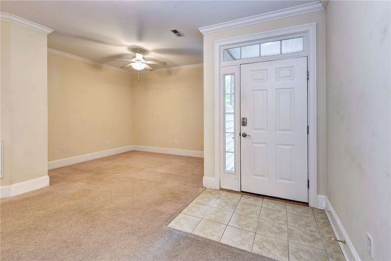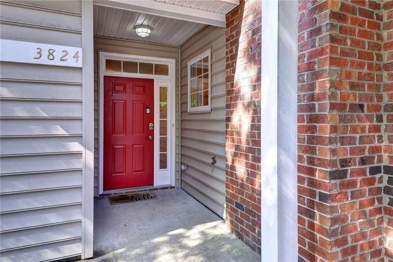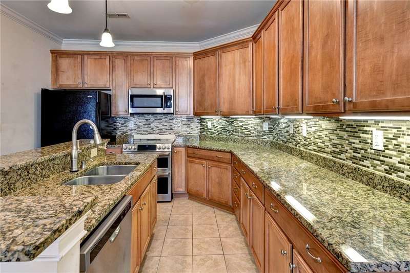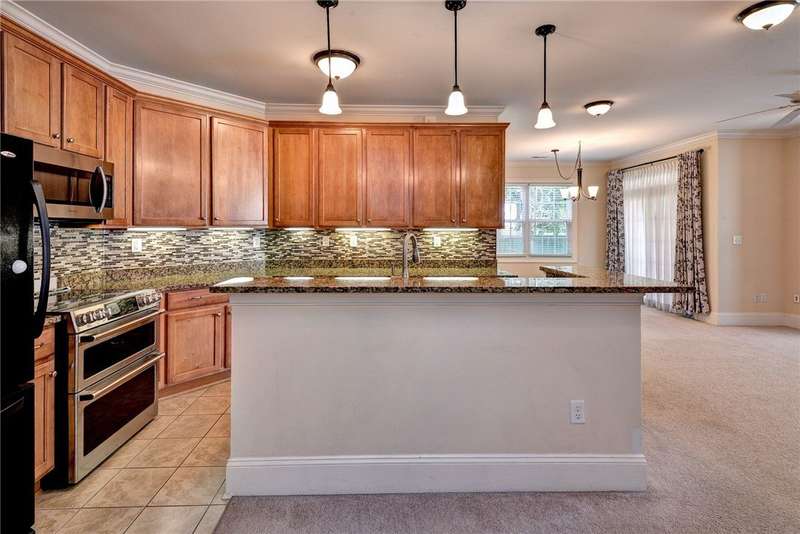 This beautifully maintained first-floor, 3 bedroom, 2 bath condo offers comfort and convenience all on one level. The welcoming, covered entrance leads to a versatile split floor plan with the primary suite privately tucked away from the other bedrooms. The updated kitchen shines with granite countertops, GE Cafe induction range (2023), Samsung microwave (2020), Whirlpool dishwasher (2020), roll-out lower cabinets, tile backsplash, under-cabinet lighting, and a touch faucet (2024). The open dining and great room make entertaining easy, while thoughtful updates like newer HVAC (2023), pendant lighting, Delta shower heads (2024), Kohler commodes (2024), added bath storage and front-loading GE Profile washer and dryer in Sapphire Blue (2023), enhance everyday living. Peacefully located between interior stairwells for added privacy and energy efficiency, this home also includes two assigned parking spaces plus visitor parking. Warm, functional, and move-in ready, it's the perfect place to call home.