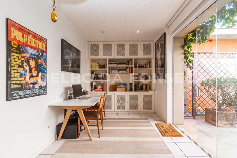 Na parte de trás da casa, a edícula em forma de L acomoda o escritório, lavanderia e suite de serviço.