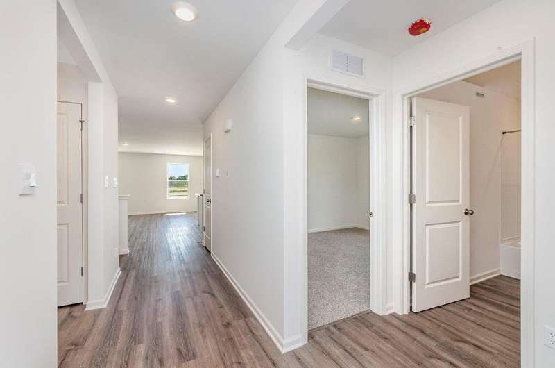 Discover the Harmony, our single family ranch floor plan at our Bauer Farm community in Portage, Indiana. This ranch home is the perfect blend of functionality and design. Find all the space you need inside this 1,498 square foot, 3 bedroom, 2 bathroom ranch home. Stepping into the entry, you'll first see the secondary bedrooms with a full bathroom nestled in between. Across the hall from bedroom 3, you will find access to the 2-car garage and the walk-in laundry room. After you pass the laundry room, the space opens up to the heart of the home. The living area is open concept, where your kitchen, dining, and great rooms combine into a space perfect for everyday living and entertaining. The chef's kitchen is complete with modern stainless-steel appliances, walk-in pantry, and a center island that is great for meal prep or casual dining. Past the great room, you'll find the primary bedroom located in the back of the home for privacy. This bedroom includes an en suite bathroom with dual sink vanity, a linen and spacious walk-in closet. The Harmonyfloor plan is sure to meet your every needs. Contact us today to find your new home at Bauer Farm. *Photos are for representational purposes only, finishes may vary per home.