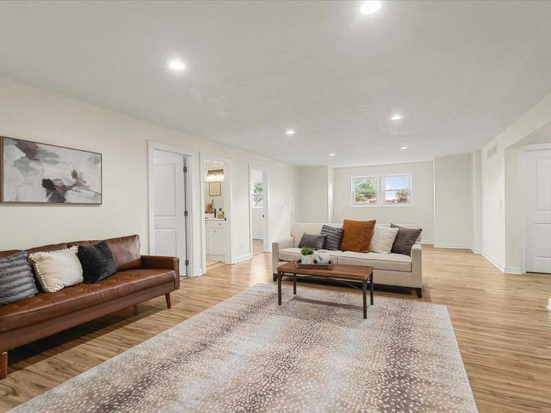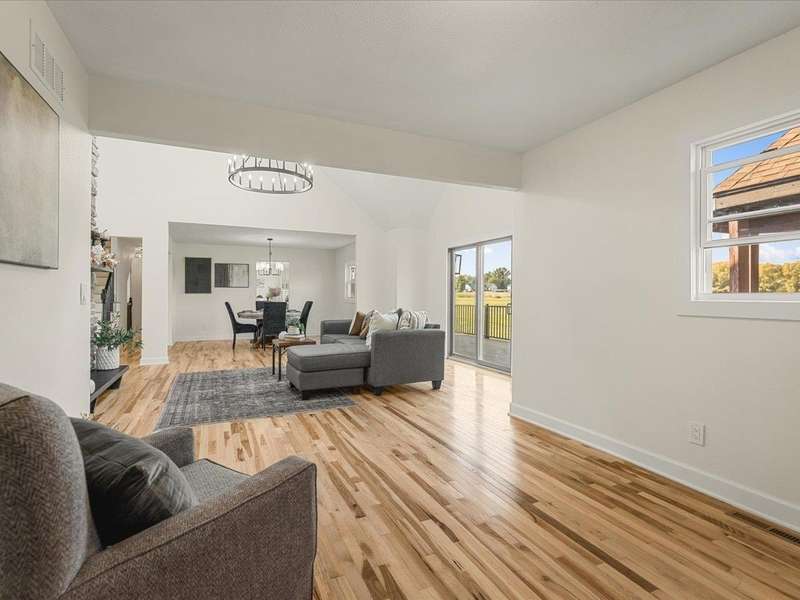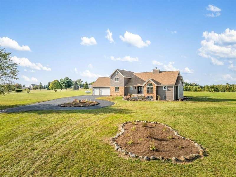 Panoramic views, spacious inside and out w/5 acres and 4,000 sq ft. This former Parade of Home has been rejuvenated inside and out! The home has 6 bedrooms, 5 baths, den, office and finished lower level! The home sets back from road w/circle driveway and new landscaping. The double glass doors open to a foyer that gives views of entire main level. Off foyer is a den w/soaring ceiling and black marble gas fireplace. Past the den is an office w/closet. Dining room is open to living room. Living room has soaring ceiling and massive stone gas fireplace, skylights, and slider to deck. Kitchen has dark lower cabinets and white uppers w/quartz counters, stone subway backsplash, and island w/seating. Laundry/drop zone off kitchen. Main floor master has 2 walk-in closets, dressing area and en-suite w/toilet closet. Up the open staircase are 3 bedrooms, one w/private en-suite. Lower level has partial exposure w/family room, game room w/wet bar, 2 bedrooms, massive full bath. Main level has hickory hardwood floors in living area, new white 2 panel doors and trim throughout. New carpet in all bedrooms, new stone tile in baths and kitchen. Enjoy the country views on new composite deck and elevate pergola w/ceiling fan. 3.5 car garage. Pickleball or basketball enthusiast? Blacktop area in backyard waiting for you! Zoned AG - bring your horses. Winnebago Schools.