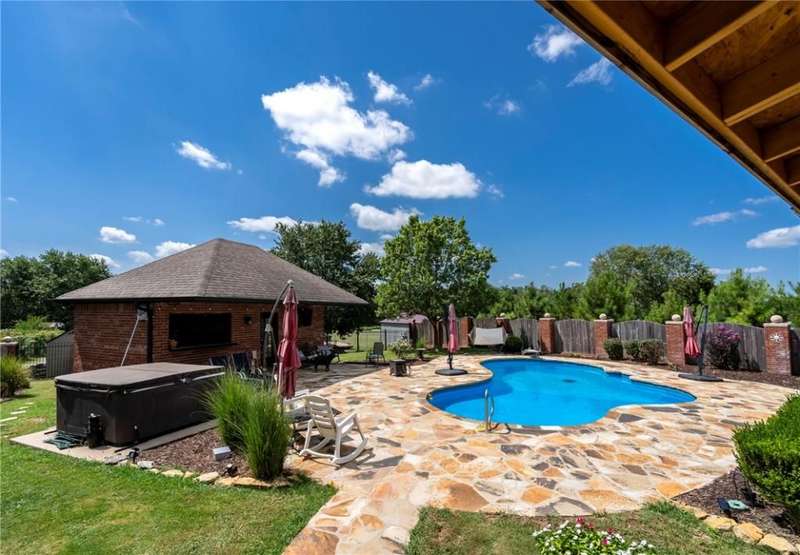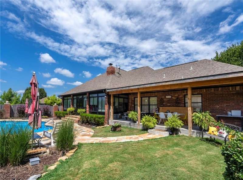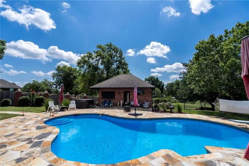 Dreaming of a shop and a pool? This home is designed for entertaining with an inground pool along with its own pool house/guest quarters. There's new stone decking around the pool, a new outdoor kitchen on the covered patio. Spacious home offers a large eat-in kitchen with lots of counter space, a pantry, island seating and desk area. Cabinet doors were replaced & hardware updated along with new light fixtures and all new granite. Primary is a true suite with double full baths and double walk-in closets. The guest bedroom area can be shut off for extra privacy. Plantation shutters throughout, gas fireplace, hardwood and tile in main living areas, sunroom. Tasteful landscaping and iron fencing lead to an acre of greenspace that includes a new 50x30 shop building for all the toys or hobbies!