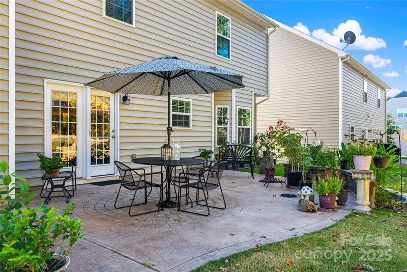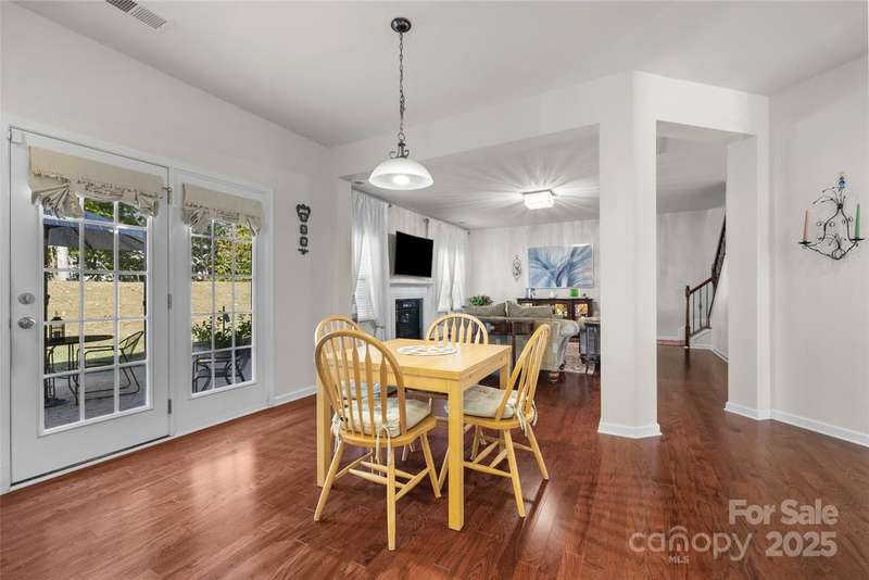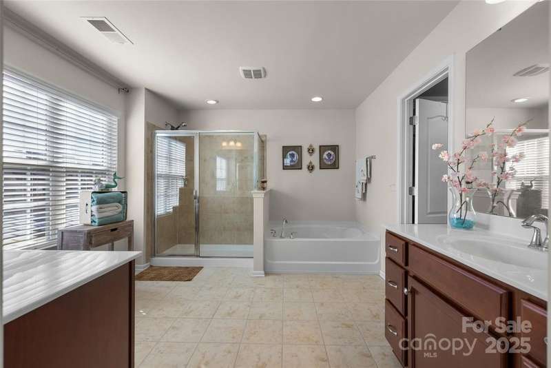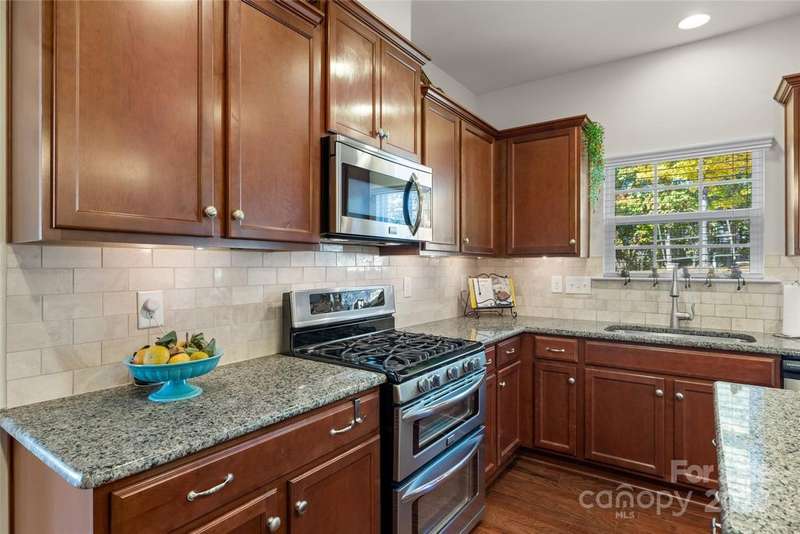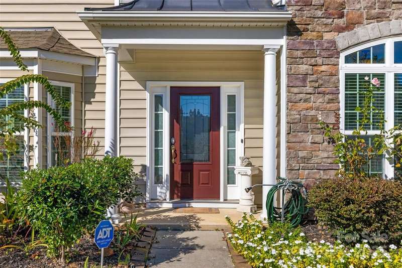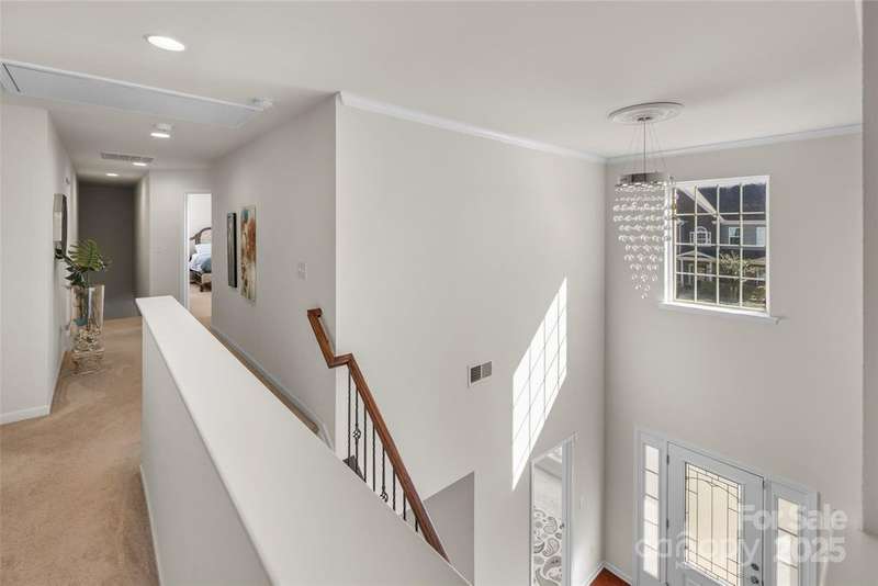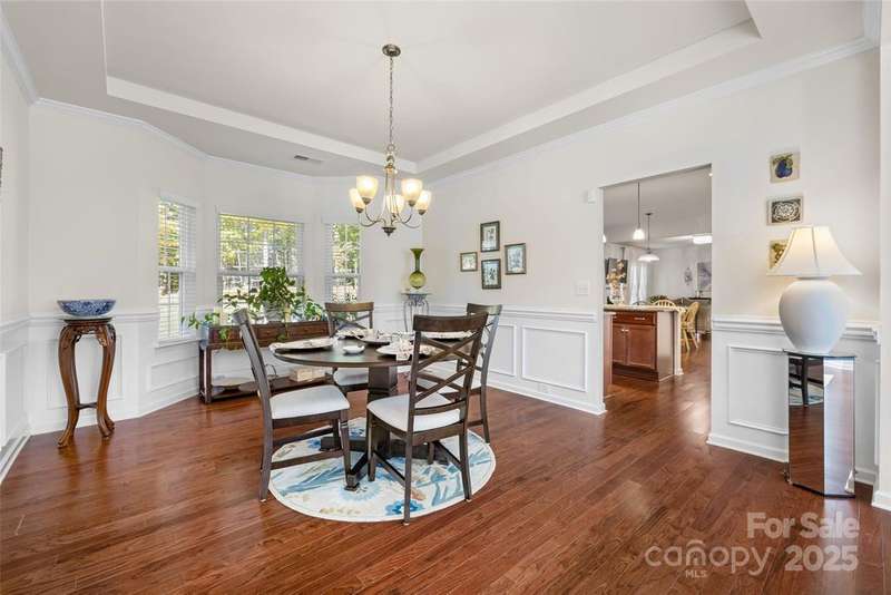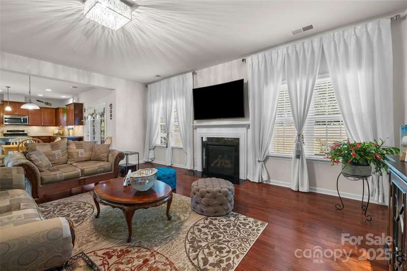 Just 3 minutes from shopping, dining & access to 485, this meticulously maintained home invites you into the front door with a glorious chandelier & richly colored engineered hardwood floors throughout the main level. Spacious Living & Dining rooms with 2 bay windows, wainscoting and trey ceiling over formal dining area. Kitchen w gigantic island, travertine backsplash, under cabinet & pendant lighting, stainless steel Frigidaire Gallery appliances, double oven & gas cooktop overlooks the enlarged patio through sliding glass doors and is open to Breakfast area and Family room. Family room has a gas fireplace and elegant light fixture. Bedroom on the main has gigantic arched window and attached Full Bath, perfect for multi-generational living. Up one of the two staircases with wrought iron spindles are 4 bedrooms & a bonus room that could be used as a bedroom. Every bedroom as well as the bedroom/bonus is connected to a full bath. Enormous Primary Suite has vaulted ceiling, sitting area, walk in closet w custom organized closet system, garden tub and his & her vanities w sink. 2 car garage has abundant cabinetry for storage. New upstairs HVAC in 2023. Security System. Take the sidewalk lined streets to the neighborhood pool and playground or catch a volleyball game on the sand courts. Located in the Hickory Ridge cluster of schools. OPEN HOUSE SATURDAY,11/22 1-3
