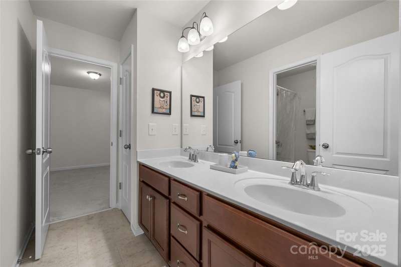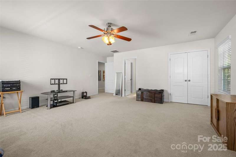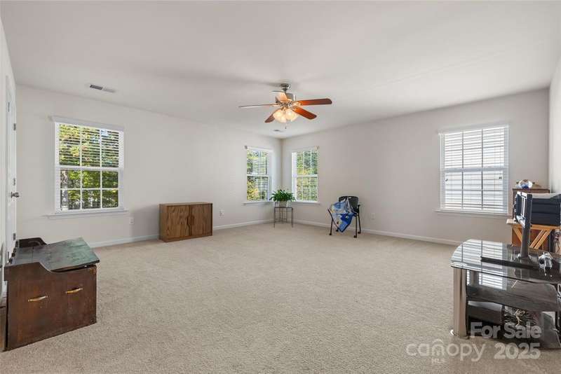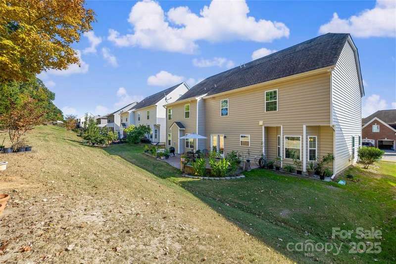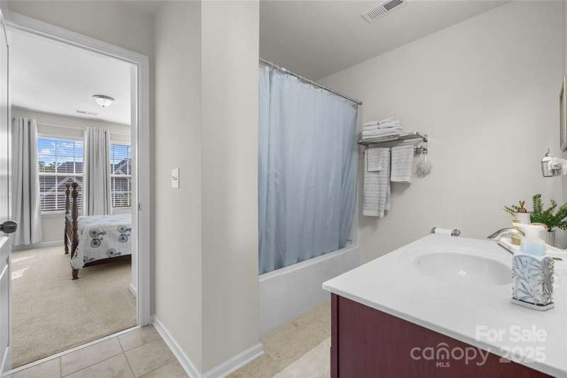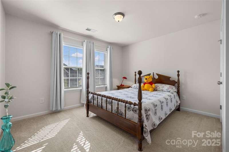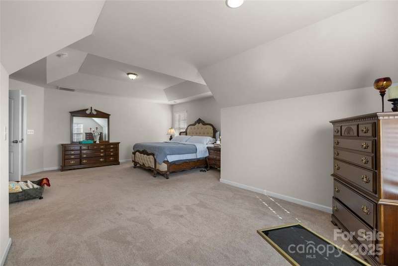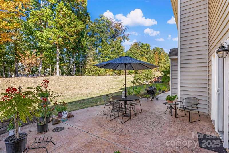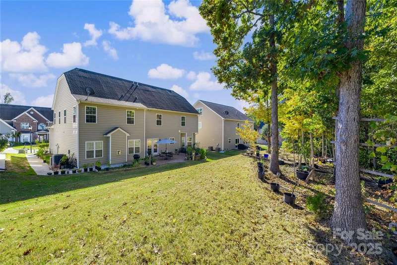 Just 3 minutes from shopping, dining & access to 485, this meticulously maintained home invites you into the front door with a glorious chandelier & richly colored engineered hardwood floors throughout the main level. Spacious Living & Dining rooms with 2 bay windows, wainscoting and trey ceiling over formal dining area. Kitchen w gigantic island, travertine backsplash, under cabinet & pendant lighting, stainless steel Frigidaire Gallery appliances, double oven & gas cooktop overlooks the enlarged patio through sliding glass doors and is open to Breakfast area and Family room. Family room has a gas fireplace and elegant light fixture. Bedroom on the main has gigantic arched window and attached Full Bath, perfect for multi-generational living. Up one of the two staircases with wrought iron spindles are 4 bedrooms & a bonus room that could be used as a bedroom. Every bedroom as well as the bedroom/bonus is connected to a full bath. Enormous Primary Suite has vaulted ceiling, sitting area, walk in closet w custom organized closet system, garden tub and his & her vanities w sink. 2 car garage has abundant cabinetry for storage. New upstairs HVAC in 2023. Security System. Take the sidewalk lined streets to the neighborhood pool and playground or catch a volleyball game on the sand courts. Located in the Hickory Ridge cluster of schools. OPEN HOUSE SATURDAY,11/22 1-3