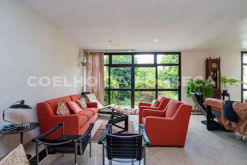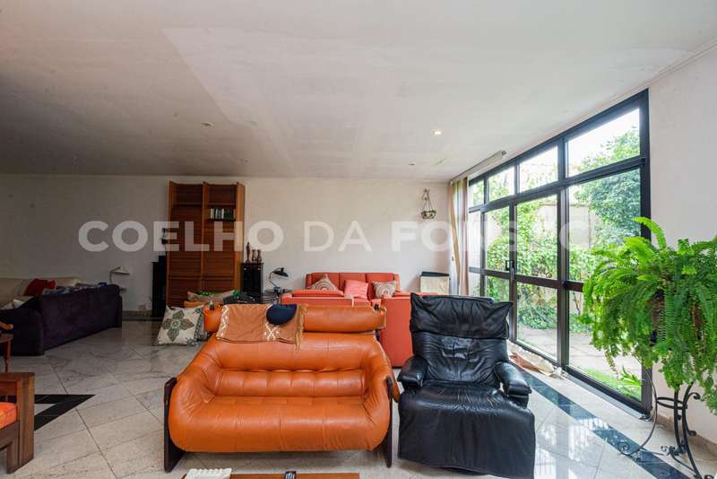 * Living com lareira e sala de jantar com grandes portas de vidro para o jardim