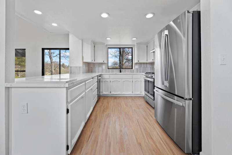 Welcome to 41763 Horseshoe Way, a beautifully remodeled home nestled in the peaceful foothills of Coarsegold. This 3-bedroom, 2-bathroom gem sits on just over an acre of land, offering the perfect blend of privacy, space, and modern comfort. Step inside to discover an inviting open layout filled with natural light, fresh interior paint, and brand-new luxury vinyl plank flooring that flows seamlessly throughout. The spacious living area with vaulted ceilings creates a warm, airy feel, perfect for relaxing or entertaining guests.The kitchen has been tastefully updated with sleek quartz countertops, stainless steel appliances, and plenty of cabinet space, making it a dream for any home chef. Both bathrooms feature custom tile showers and modern vanities, giving the home a fresh, contemporary vibe. Recent exterior updates include new paint, a new garage door, rain gutters, and a brand-new HVAC system, ensuring year-round comfort and curb appeal.Outside, enjoy the peaceful surroundings from your covered patio, ideal for morning coffee or evening gatherings. Located just minutes from Yosemite Lakes amenities and within easy reach of Yosemite National Park, this home offers the best of both convenience and nature.The best part? This home is vacant and move-in readyno waiting, no delays. Come take a private tour and see for yourself why 41763 Horseshoe Way is the perfect place to call home. Schedule your showing today!