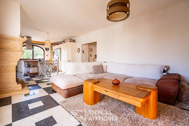 The villa is organized around three independent living spaces that can be connected or used separately as needed. On the ground floor, a complete apartment with living room, open kitchen, sleeping area, and two bathrooms with toilets can easily be divided into two separate studios. Upstairs, a second apartment offers a living room, storage area, master suite with built-in wardrobes, WC, and a fully equipped kitchen opening onto a private terrace. The main part of the house features a spacious living room with fireplace, an equipped kitchen, an office, and a dining room. Designed in a U-shape, it is centered around a large terrace that can be fully enclosed, turning it into an additional living space during cooler seasons.