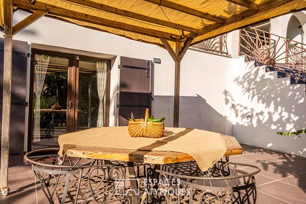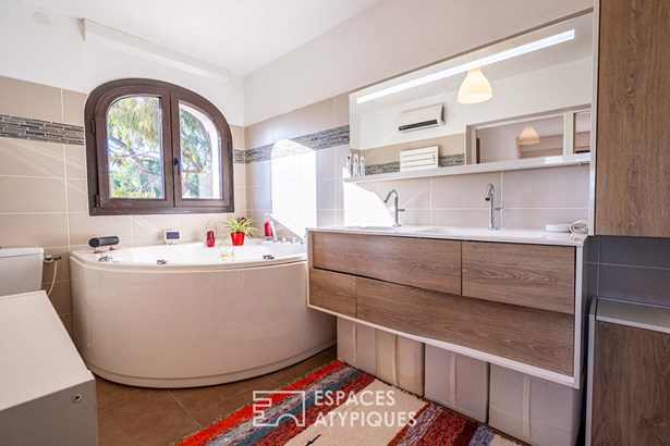 Upstairs, two bedrooms, including a master suite opening onto a long terrace with open views of nature and the mountains, are complemented by a contemporary bathroom. Both functional and full of character, this villa charms with its southern atmosphere, brightness, and vast potential.