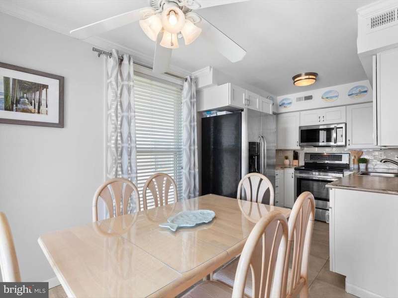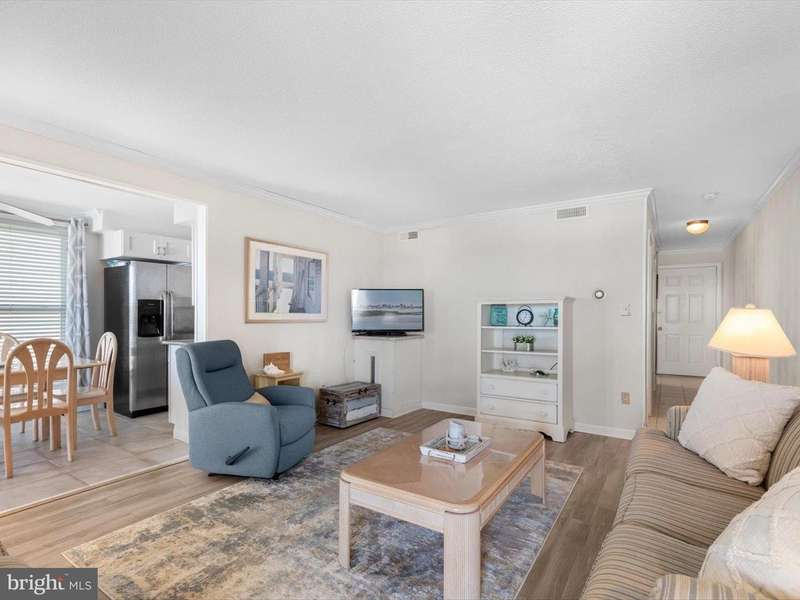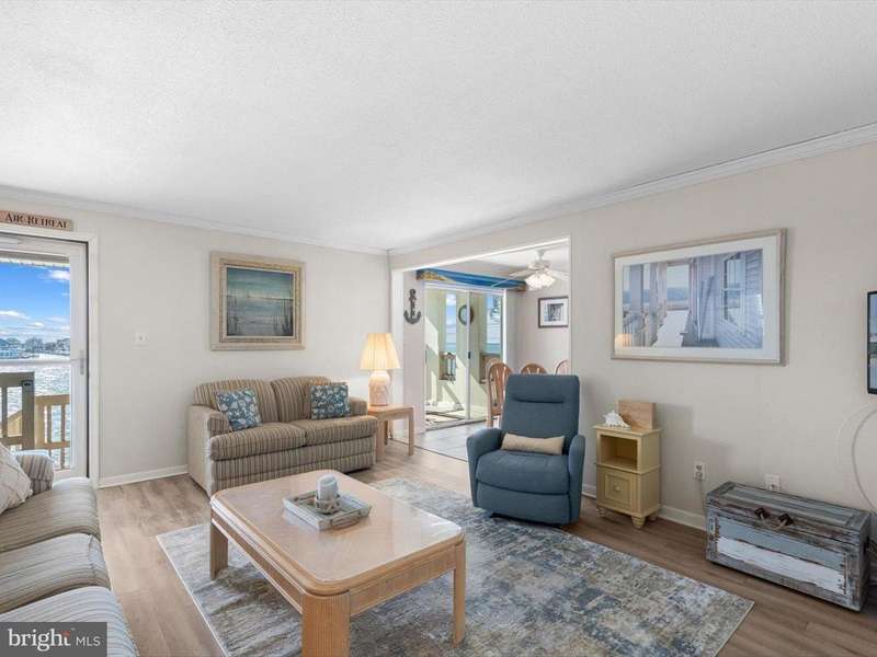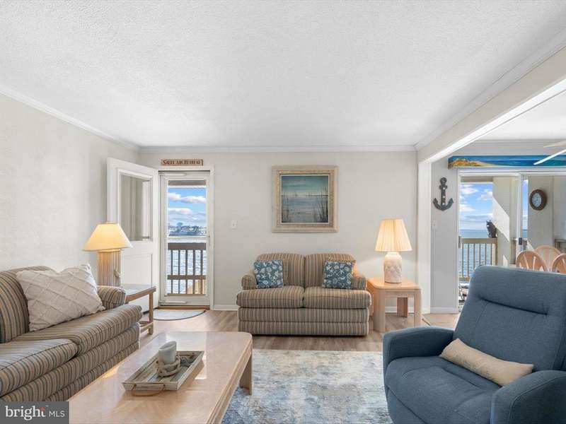Welcome to your slice of coastal paradise where million-dollar bay views, salty breezes, and carefree beach living await. This top-floor condo offers panoramic vistas of the water, with your very own boat slip just steps from the door. Perfectly positioned on the third floor with no neighbors above, it's the ideal spot to unwind, entertain, and soak up the best of Ocean City living. An enclosed entry from the street side provides protection from the elements, offering comfort and convenience year-round. Step inside to a bright, beachy interior with light neutral tones and easy-care laminate plank flooring. The open-concept living and dining areas flow effortlessly into the kitchen, where crisp white, soft-close cabinetry pairs beautifully with stainless steel appliances and a convenient pantry cabinet, creating a bright and functional space that makes cooking a pleasure. The slider doors off the dining area lead to a private balcony, your front-row seat to sparkling bay views, seabird sightings, and unforgettable sunsets. The spacious primary bedroom offers serene water views from both windows, while the second bedroom comfortably fits two queen beds, perfect for friends and family visiting for a weekend getaway. Two full bathrooms and an in-unit washer and dryer add convenience, making this home as functional as it is inviting. Sold fully furnished and ready to enjoy, this turnkey condo is all about laid-back coastal living. Whether you're sipping morning coffee with a view, heading out for a day on the boat, or catching ocean breezes after a beach day, this is the ultimate bayside retreat. Just bring your beach towels, suntan lotion, and a sense of adventure-everything else is already here.
