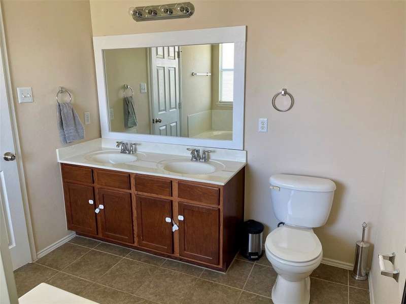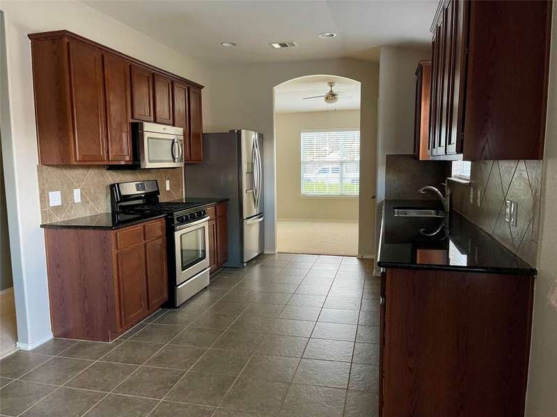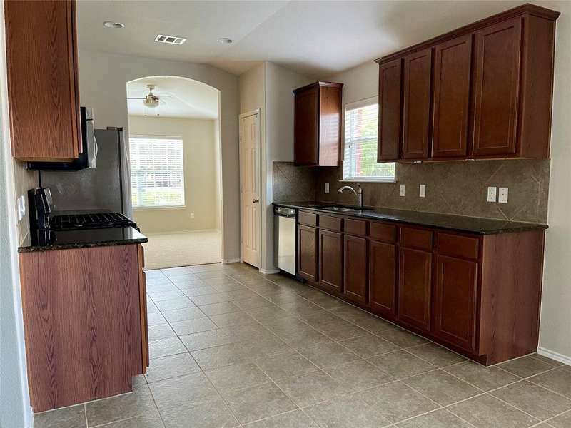 Charming 3-bedroom, 2-bathroom house in the Retreat at Blackhawk, convenient to the 130 and 45 toll roads. Large kitchen boasts granite countertops with stainless steel appliances, including a gas range/oven and French-door refrigerator, and is open to an airy eat-in dining area and spacious living room. Flex room with large window at front of house can be used as a home office, playroom, or family room. Huge primary bedroom includes an en-suite secondary room perfect for a nursery or home office, bathroom with dual vanities, garden tub and separate shower, and large walk-in closet. Utility room with washer/dryer hookups and shelving for extra storage connects to the 2-car garage (with remote garage door opener). Large, fully fenced backyard and covered patio complete this lovely home.