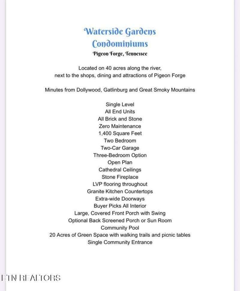 Welcome to Waterside Gardens Condominiums! Construction on this customizable Phase 3 unit is scheduled to begin in December and will be finished next summer. Located in the heart of Pigeon Forge on 47 beautiful acres along the Little Pigeon River, and minutes from the wonders Dollywood, Gatlinburg and the Smoky Mountains, this new construction development features all single-level, two-bedroom, two-car garage duplexes. This perimeter unit maximizes privacy and the brick and stone exterior means you can enjoy zero maintenance living from your covered front porch or back patio. Best of all, you get to customize all interiors from a wide selection of granite kitchen tops, soft-close cabinets, LVP flooring, and any paint color you choose. Each condo features a stunning stone fireplace, living room and bedroom ceiling fans, stainless appliances, cathedral ceilings, elevated toilets and wide 36'' doors. Waterside Gardens will have a community pool and 20 acres of green space with a walking trail and picnic tables for residents and their pets to enjoy. With only 16 units in this phase, these will sell quickly. Waterside Gardens is being developed and constructed by the same team that built Riverbend Gardens and Creekside Gardens in Sevierville.