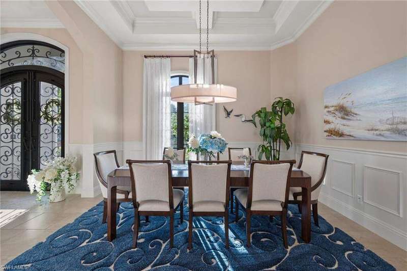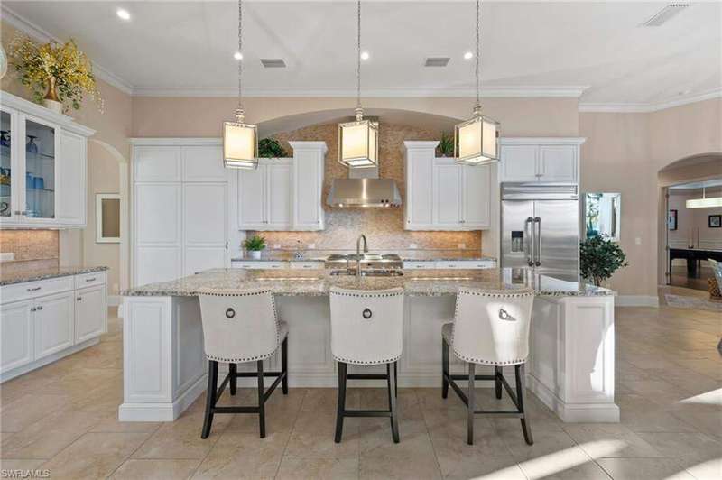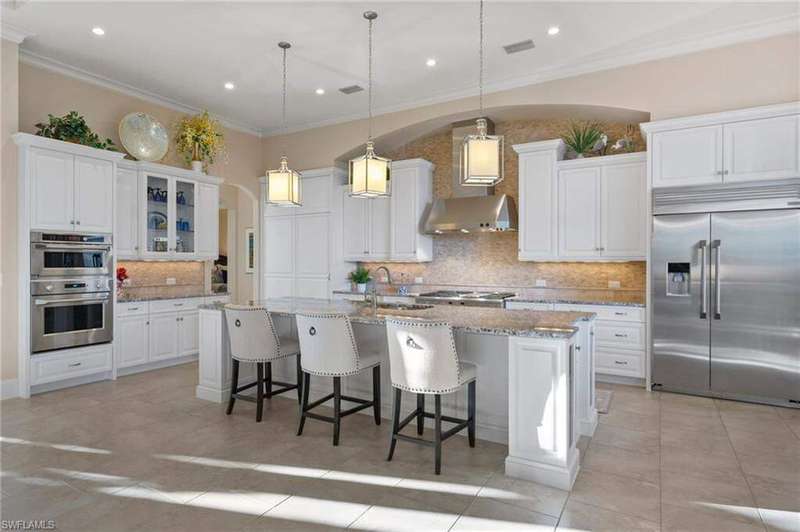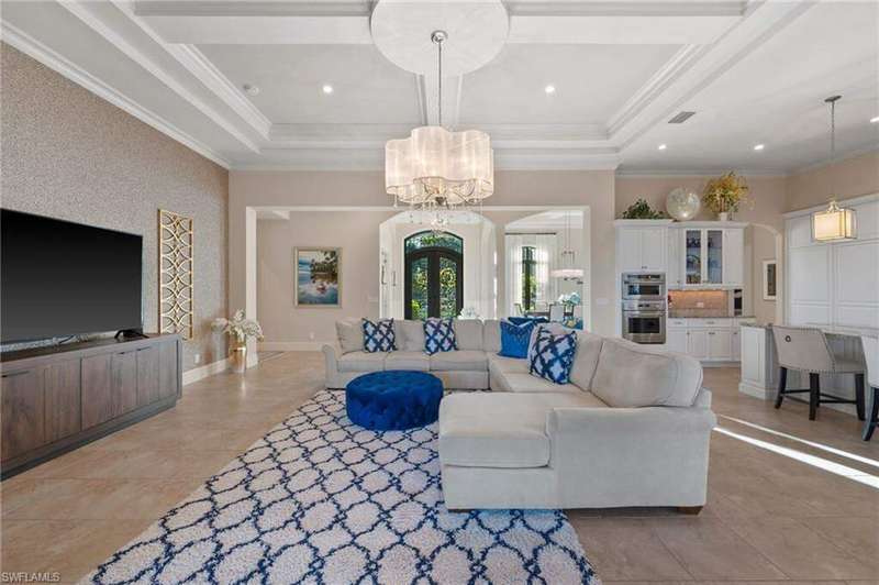 Welcome to wonderful! - This truly exceptional, beautifully appointed home is tucked away on over half an acre and welcomes you with a grand covered portico flanked by dual garages and ample guest parking. Step through the elegant glass and metal front door into a spacious foyer that sets the tone for the custom craftsmanship found throughout the home. From intricate inlaid tile flooring to coffered ceilings, every detail has been thoughtfully designed. Enjoy breathtaking sunrise views from the expansive living room or relax on the screened lanai - perfect for year-round indoor-outdoor living. The luxurious primary suite is a serene retreat featuring a light-filled bedroom and a spa-like bathroom with a soaking tub, dual vanities, and a multi-head walk-in shower. Ideal for entertaining, the home includes a versatile flex room complete with a wet bar - perfect for a game room, fitness space, or media lounge. Even the laundry room is impressive, offering generous storage and a smart, multi-purpose design. Step outside to your private oasis: the lanai boasts a wood-paneled ceiling, full outdoor kitchen, fireplace, and abundant seating - all overlooking a stunning saltwater pool and spa with a tranquil water feature, and panoramic views of the golf course, lake, and surrounding nature. Additional Features Include: plantation shutters throughout, built-in speaker system (gathering room, primary suite, kitchen, and lanai), wired for security, decorative front yard fountain, main A/C unit (2023),This home offers luxury, functionality, and beauty in equal measure. Don't miss the opportunity to make it yours!