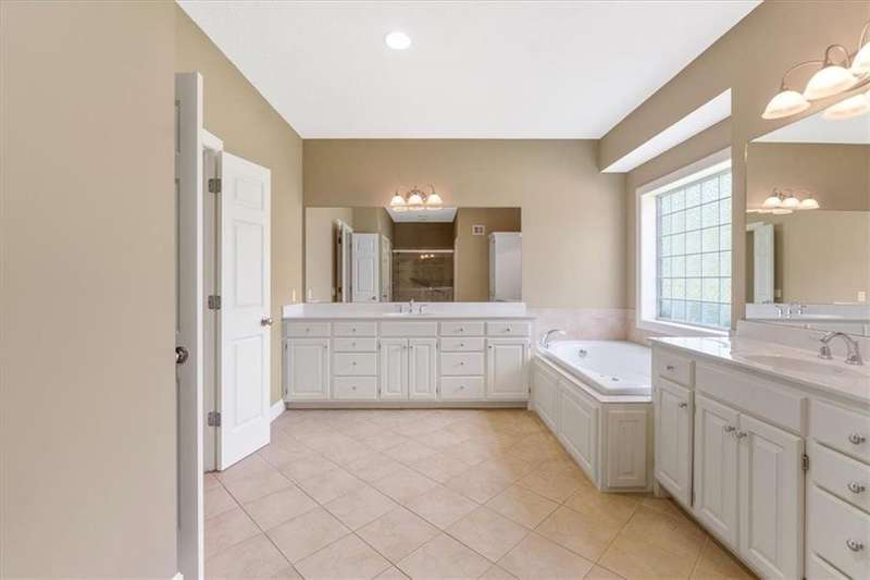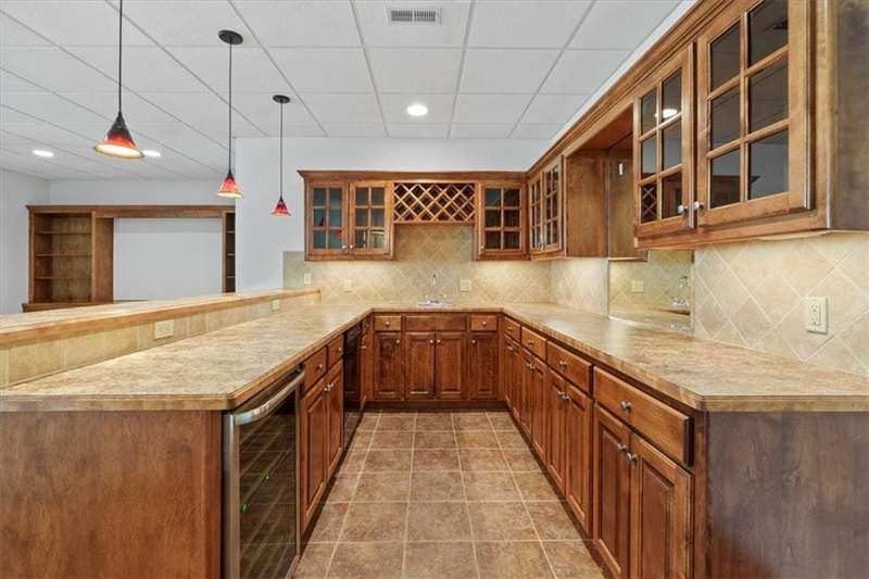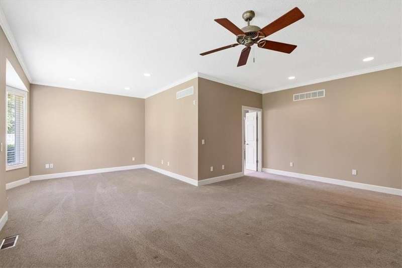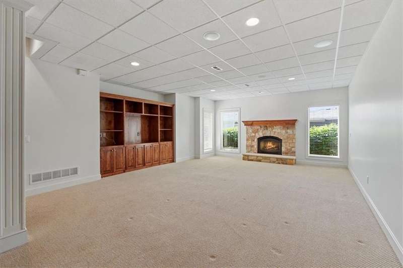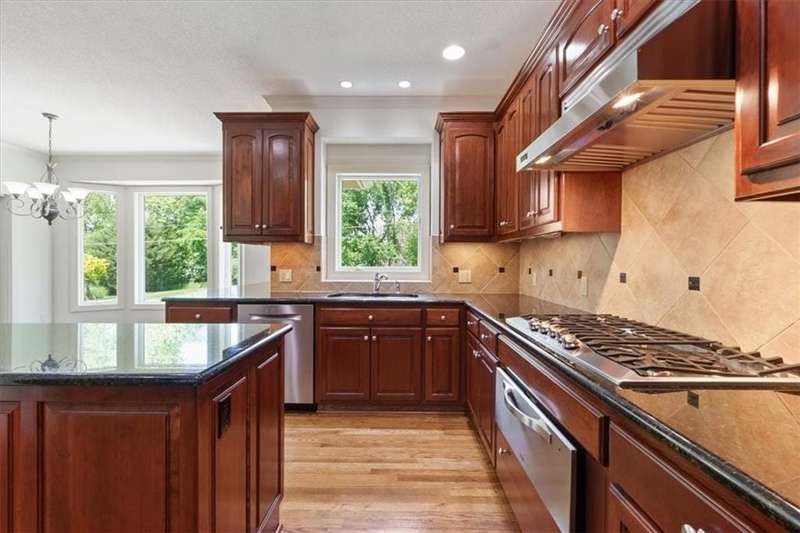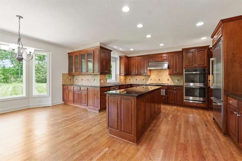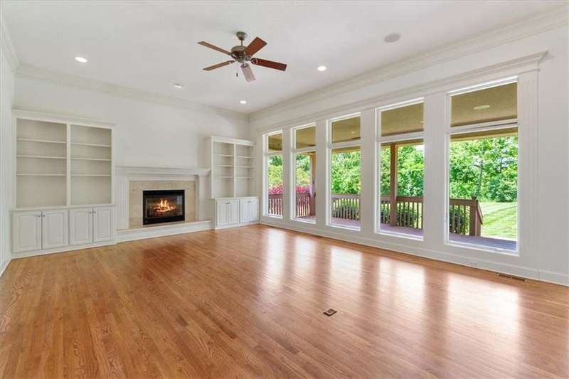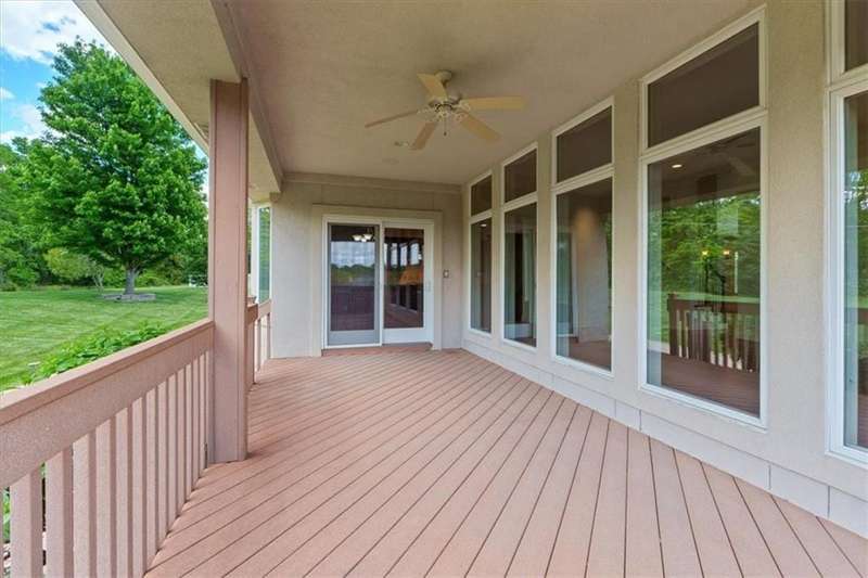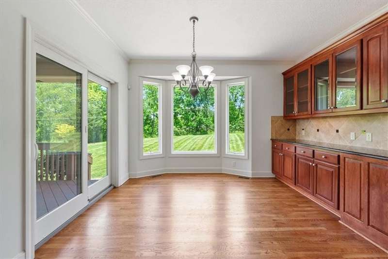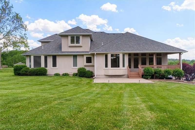 Welcome to this beautifully designed home in the sought-after Sunridge Estates of Blue Springs, offering over 5,500 square feet of elegant living space with four bedrooms and four and a half baths. From the moment you step inside, soaring ceilings and expansive floor-to-ceiling windows create a light-filled and open atmosphere, ideal for both entertaining and everyday living. The formal living room flows seamlessly into the dining area, with custom millwork, wood floors throughout the main floor, and built-in cabinetry add warmth and sophistication. The spacious kitchen, featuring cherry cabinets, granite countertops, a large walk-in pantry, and high-end appliances, including a Viking refrigerator, range, and warming drawer. The adjoining hearth room offers cozy charm and views of the private, wooded backyard. Step outside to enjoy the covered deck, walkout patio, and stone pathway, all perfect for gatherings or peaceful relaxation. The main-floor primary suite is a true retreat with a luxurious bathroom that includes dual vanities, a sun-soaking tub, generous countertops, and an expansive walk-in closet. A full laundry room just off the kitchen features ample cabinetry, a sink, and easy access to the oversized three-car garage, which boasts extra-deep bays and towering ceilings.Upstairs, youll find three additional bedrooms, two connected by a Jack and Jill bath, and a third with its own private en-suite and walk-in closet. The finished lower-level daylight basement offers tall ceilings, a gas fireplace, full wet bar with dishwasher and wine fridge, a full bath, and ample space for entertaining. The unfinished section provides substantial storage with built-in shelving and 12-foot ceilings. Additional features include dual HVAC systems (newer), two 50-gallon water heaters, plantation shutters on all front-facing windows, and a 50-year roof installed in 2019. This home offers a rare combination of elegance, function, and comfort in a prime location.