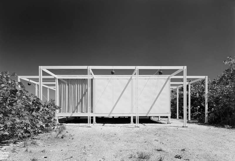 The ingenious cubist design was conceived using an eight foot by eight foot grid, both horizontally and vertically. The lightly raised steel frame supports movable wood panels that can be opened or closed, allowing an effortless relationship to indoor and outdoor space, as the large panels are attached to pulleys and seven red-painted cannonball weights. It is this feature that earned the guesthouse the nickname "The Cannonball House". Rudolph himself said about the structure "With all the panels lowered the house is a snug cottage, but when the panels are raised it becomes a large screened pavilion". The guesthouse was one of Rudolph's favorite projects and it has been justifiably celebrated and honored since being constructed, and has been featured in Progressive Architecture, Architectural Forum and Architectural Record. It can also currently be seen in Materialized Space, the retrospective of Paul Rudolph's work currently on view at the Metropolitan Museum of Art in New York City.