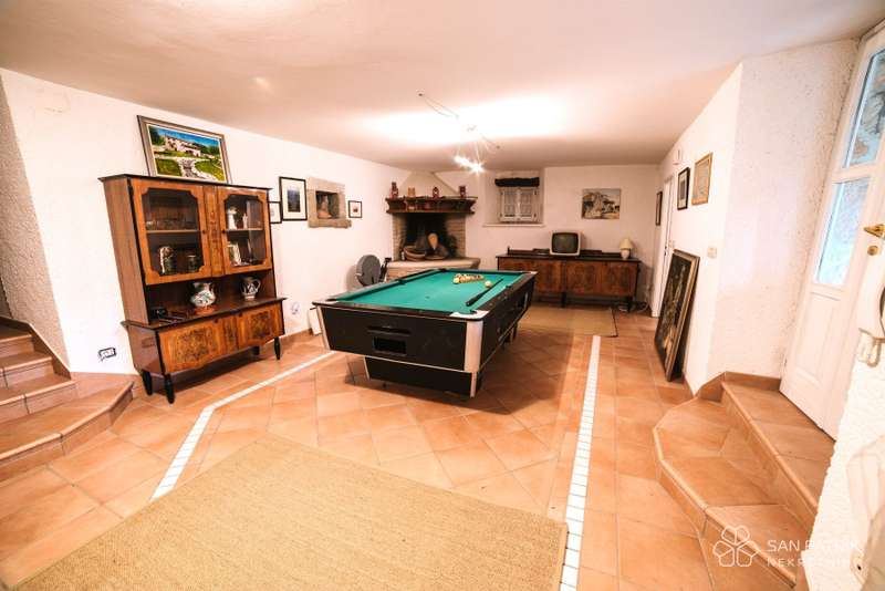 Diverse recreational facilities: a billiards table with a fireplace, table tennis, trampoline, bocce court, volleyball court, and cycling paths within the grounds.