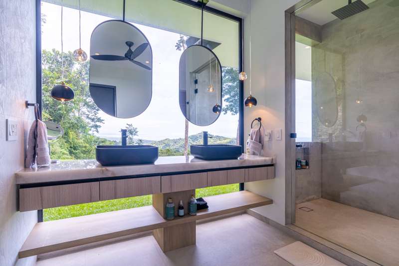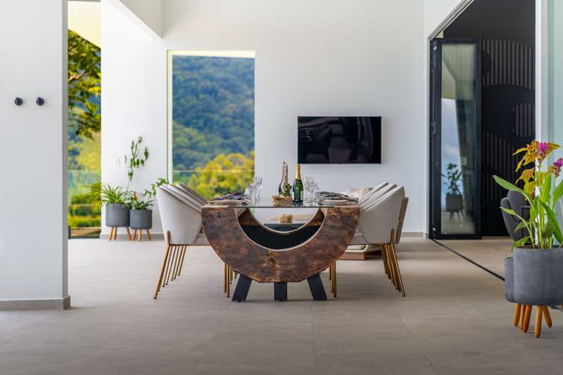Commanding 280-degree panoramic ocean views, Casa Armonía Elements gazes across the deep blue Pacific, taking in three distinct whitewater coastlines, Caño Island, and the iconic Whale’s Tail formation at Marino Ballena National Park. Every evening, the sky bursts into color with year-round sunsets, while the twinkling lights of Ojochal shimmer below, painting a scene of magic and mystery.