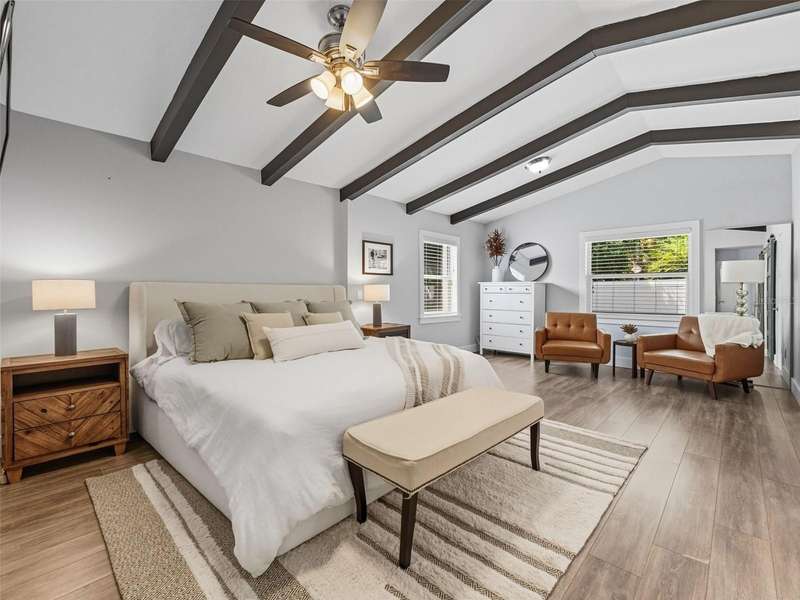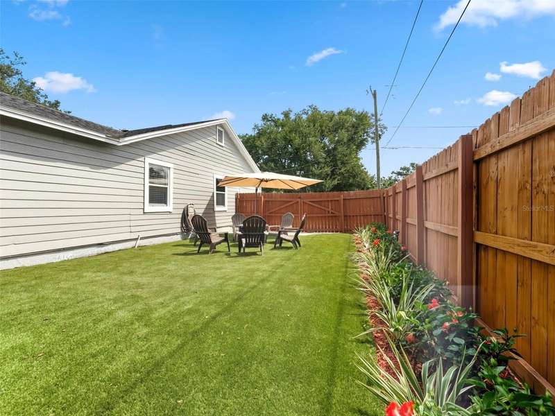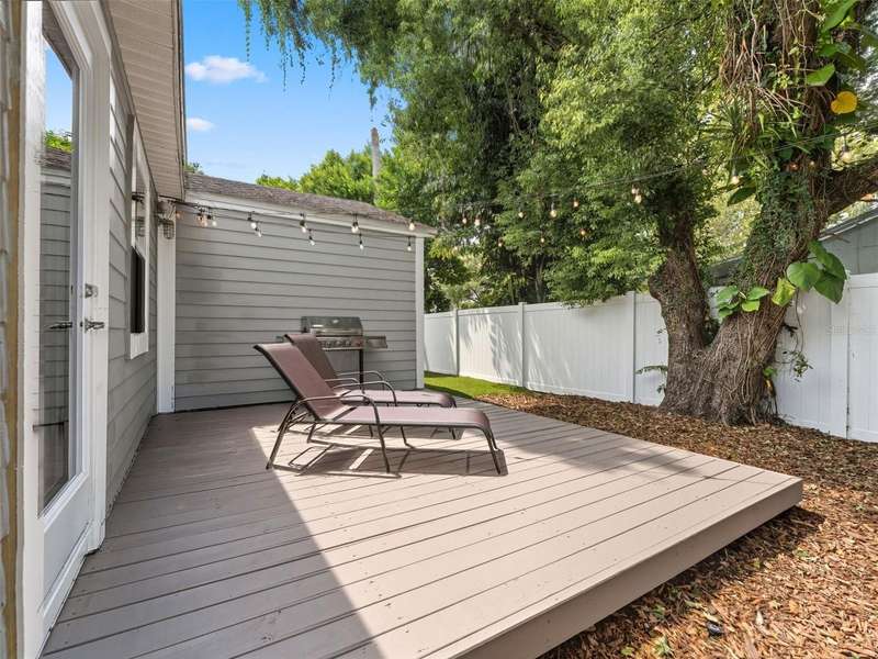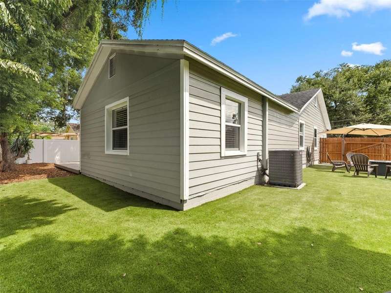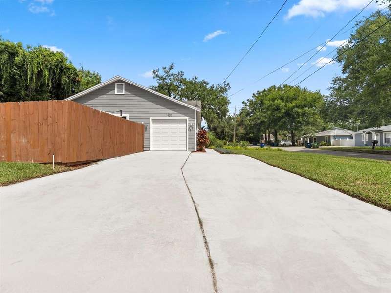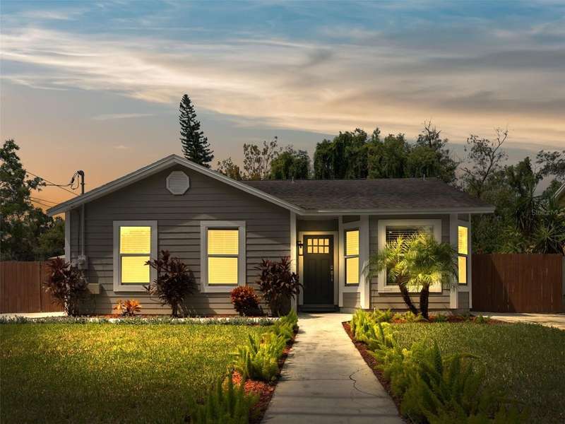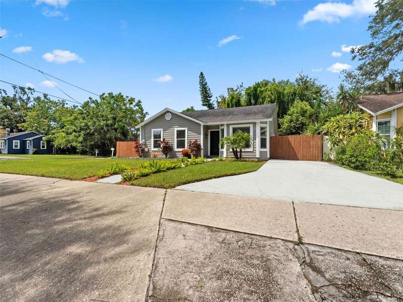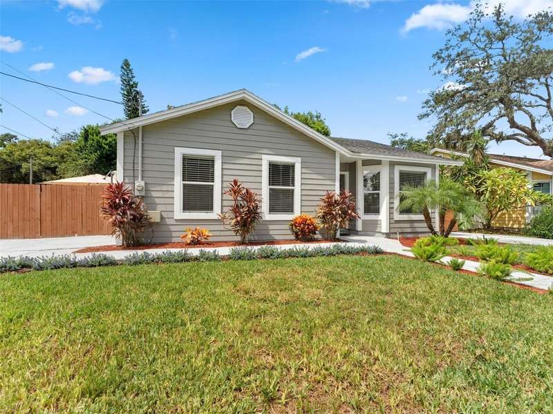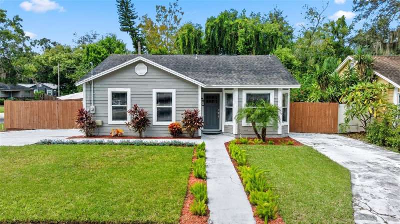 Under contract-accepting backup offers. One or more photo(s) has been virtually staged. Welcome to this beautifully updated and move-in-ready home, nestled on a spacious corner lot in the highly sought-after Old Seminole Heights neighborhood. Offering the perfect blend of modern style and comfort, this home is located just minutes from top dining, local favorites, shopping, and entertainment options, including Armature Works, Midtown, Hyde Park, and Downtown Tampa. Step inside to an open and airy layout, where vaulted ceilings and contemporary wooden beams create a warm and inviting atmosphere. The abundance of natural light pours in from the bay windows, highlighting the luxury finishes throughout. The chef-inspired kitchen boasts an oversized kitchen island and stone backsplash, stainless steel appliances, shaker cabinets, and ample seating at the breakfast nook, kitchen island, or dining room. Perfect for entertaining or enjoying a quiet night in. The sprawling primary suite is a true retreat, offering a cozy sitting area, a custom walk-in closet, and a luxurious en suite bathroom with a spa-like double rainfall shower—your own private oasis. Two additional generously sized bedrooms share a beautifully remodeled full bath, providing ample space for family or guests. The outdoor space is just as impressive, featuring a fully fenced backyard with lush landscaping and a new artificial turf lawn. Multi-zone irrigation with an electronic module ensures your yard stays vibrant year-round. Enjoy sunny days or evenings grilling and lounging on the deck, or take advantage of the additional green space for outdoor activities. Parking is a breeze with a rare 1-car garage and two driveways, providing plenty of room for guests or additional vehicles. Don't miss the chance to own this stunning home in a prime location with everything you need right at your doorstep. Schedule your showing today!