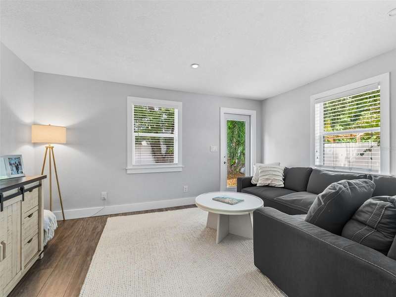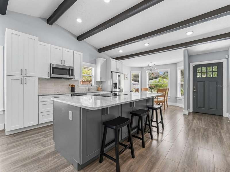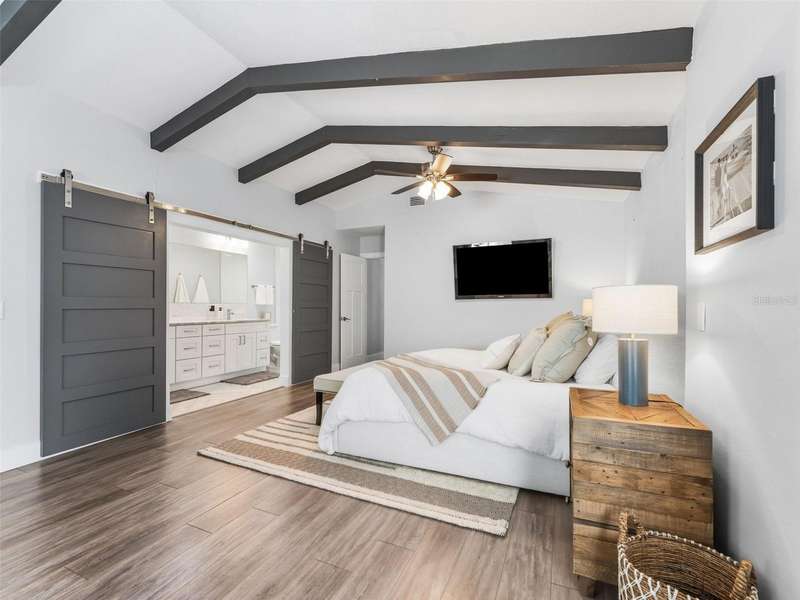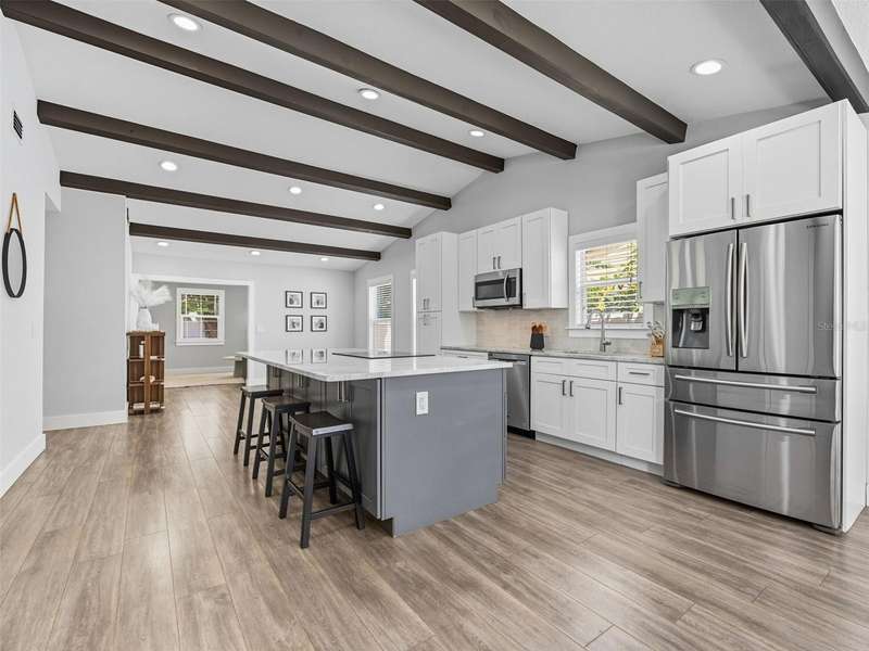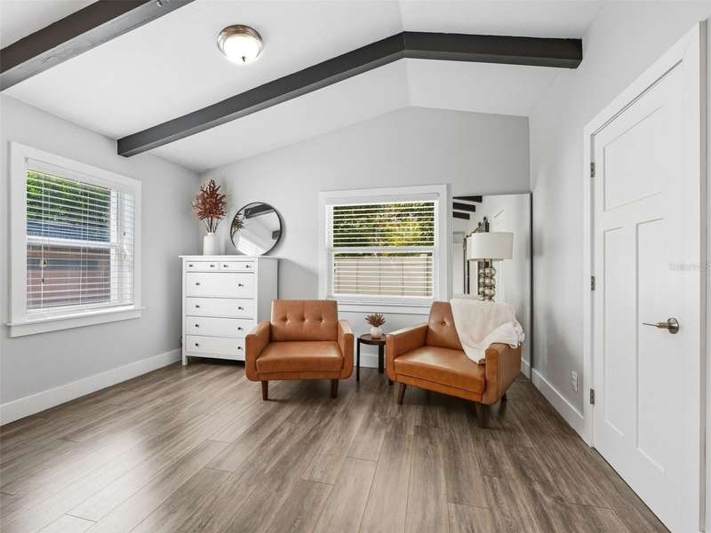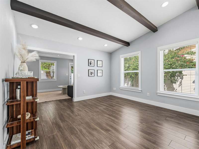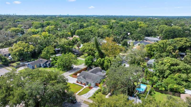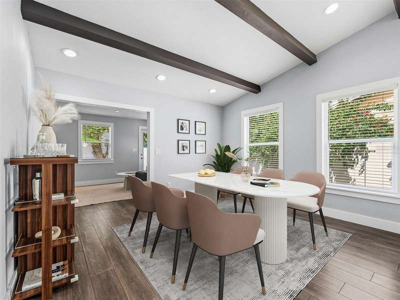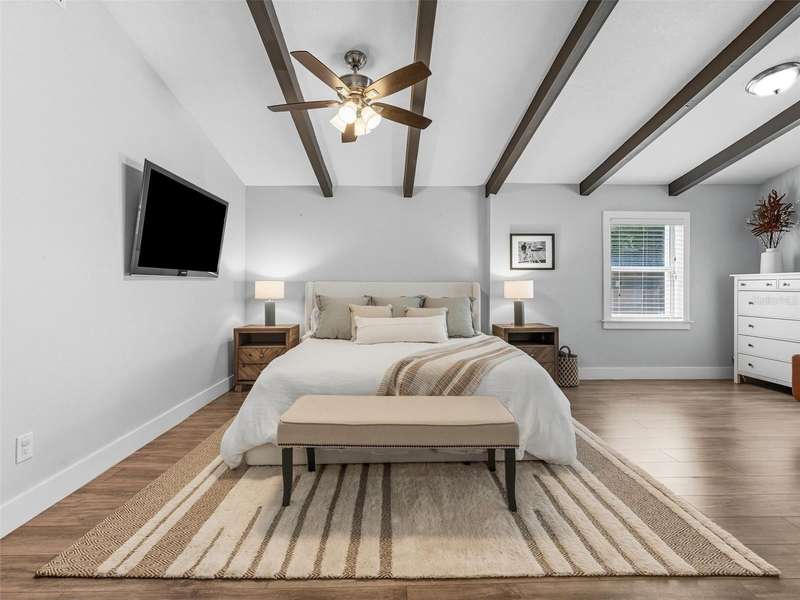 Under contract-accepting backup offers. One or more photo(s) has been virtually staged. Welcome to this beautifully updated and move-in-ready home, nestled on a spacious corner lot in the highly sought-after Old Seminole Heights neighborhood. Offering the perfect blend of modern style and comfort, this home is located just minutes from top dining, local favorites, shopping, and entertainment options, including Armature Works, Midtown, Hyde Park, and Downtown Tampa. Step inside to an open and airy layout, where vaulted ceilings and contemporary wooden beams create a warm and inviting atmosphere. The abundance of natural light pours in from the bay windows, highlighting the luxury finishes throughout. The chef-inspired kitchen boasts an oversized kitchen island and stone backsplash, stainless steel appliances, shaker cabinets, and ample seating at the breakfast nook, kitchen island, or dining room. Perfect for entertaining or enjoying a quiet night in. The sprawling primary suite is a true retreat, offering a cozy sitting area, a custom walk-in closet, and a luxurious en suite bathroom with a spa-like double rainfall shower—your own private oasis. Two additional generously sized bedrooms share a beautifully remodeled full bath, providing ample space for family or guests. The outdoor space is just as impressive, featuring a fully fenced backyard with lush landscaping and a new artificial turf lawn. Multi-zone irrigation with an electronic module ensures your yard stays vibrant year-round. Enjoy sunny days or evenings grilling and lounging on the deck, or take advantage of the additional green space for outdoor activities. Parking is a breeze with a rare 1-car garage and two driveways, providing plenty of room for guests or additional vehicles. Don't miss the chance to own this stunning home in a prime location with everything you need right at your doorstep. Schedule your showing today!