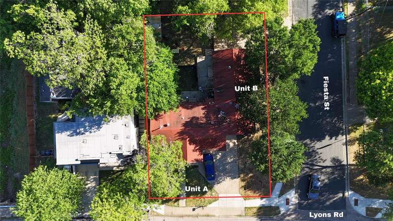 Rare development opportunity on a corner lot in East Austin. Situated on a 7,740 sq ft SF-3 zoned lot, this front-and-back duplex offers two fully separate units — Unit A (3 bed / 2 bath) faces Lyons Rd, and Unit B (2 bed / 1 bath) faces Fiesta St — each with its own driveway, private yard space, and separate entry. Ideal setup for A/B condo development, new construction duplex, or full redevelopment (buyer to verify). Corner orientation offers maximum flexibility for design, privacy, and resale. Located in a rapidly growing pocket near Downtown, Springdale General, and Lady Bird Lake.