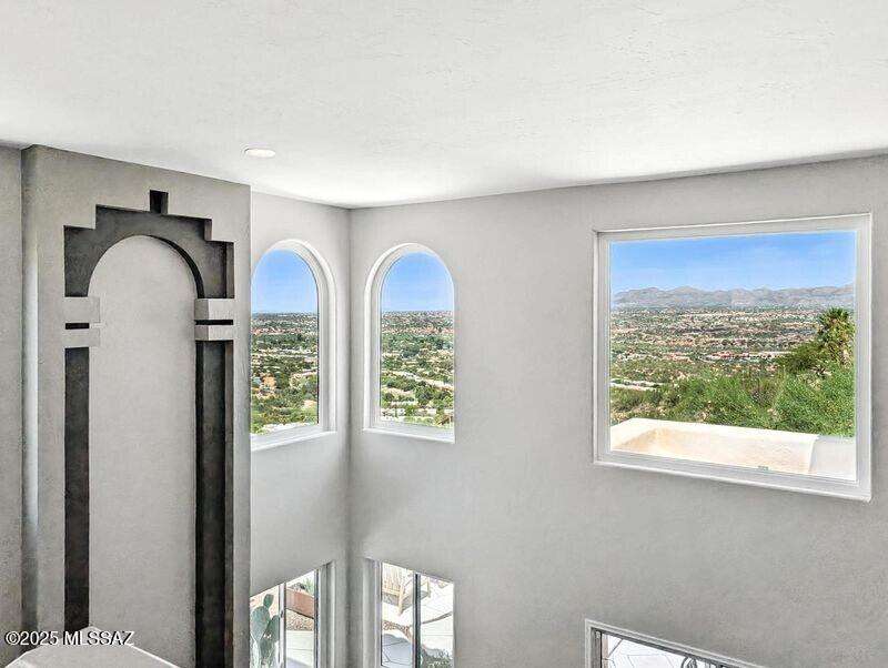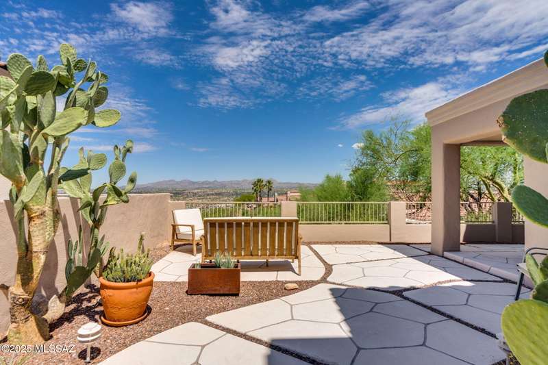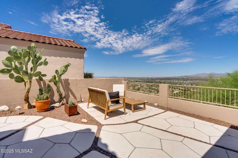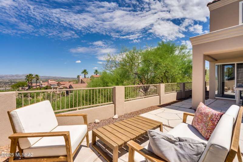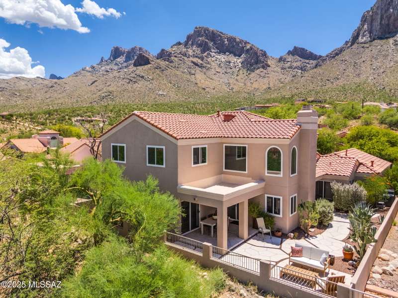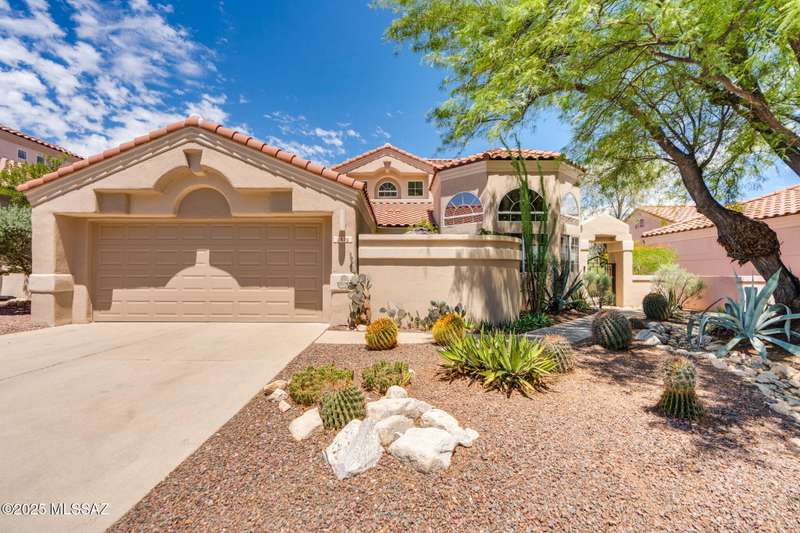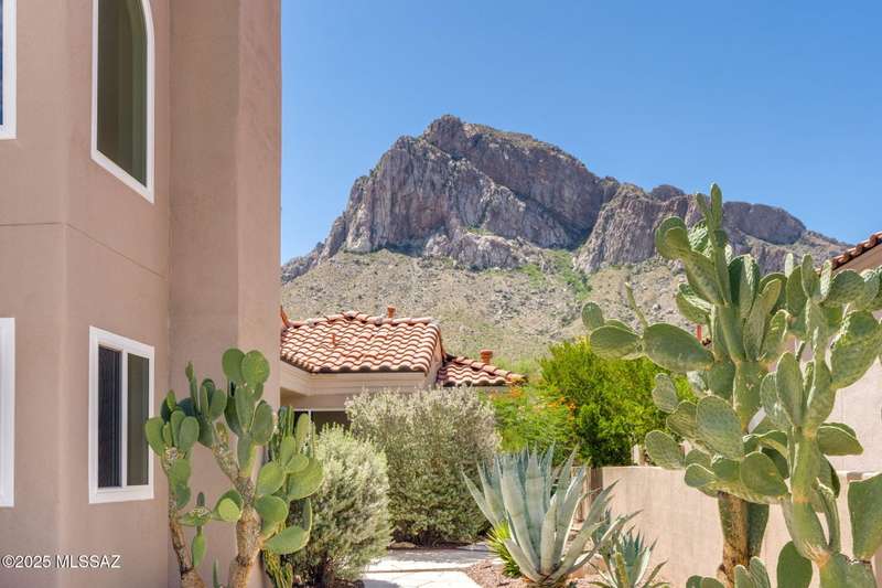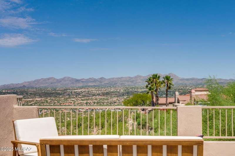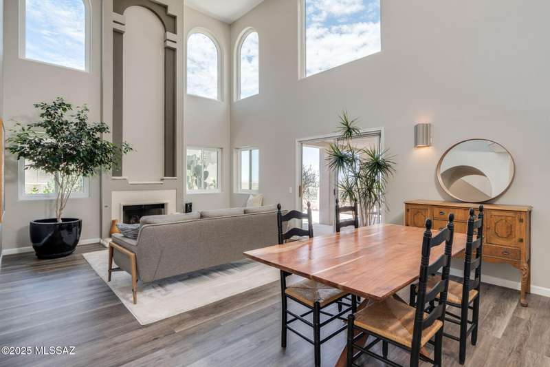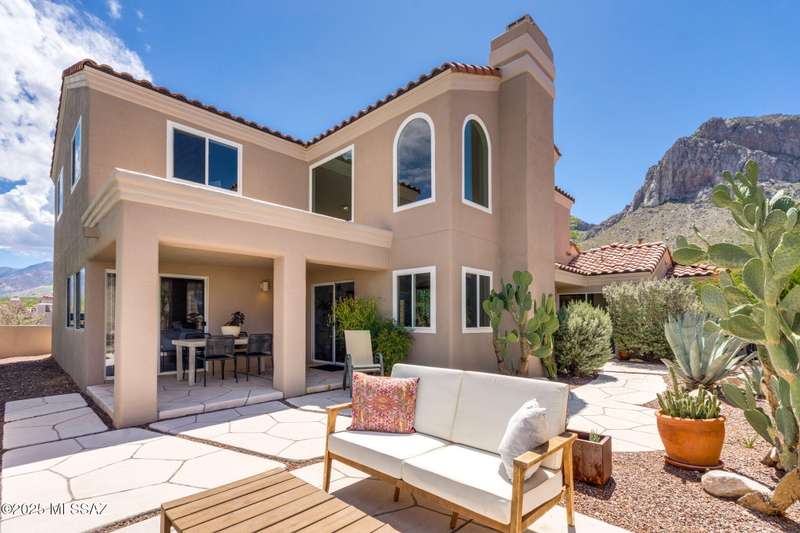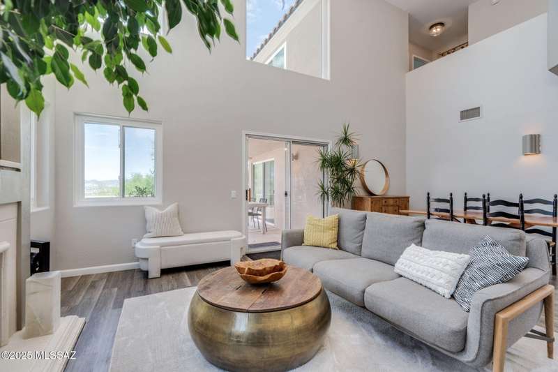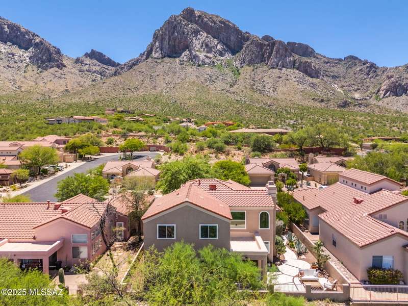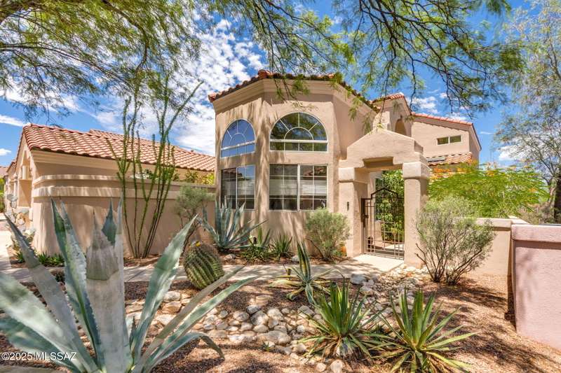 Contemporary 3BD/2.5BA +Den (2,678 sf) residence situated high on THE RIDGE in prestigious, guard gated La Reserve affords ultimate privacy and views. This elegant two-story home overlooks the valley and beyond boasting dramatic views of Pusch Ridge Wilderness plus awe-inspiring sunsets, valley lights and distant mountain vistas. Charming, gated courtyard flows to a neutral and bright floor plan showcasing soaring & vaulted ceilings, high arched windows, elegant French doors, wood-tone ceramic plank tile, plus dramatic floor-to-ceiling fireplace surround in living/dining room. Spacious den off kitchen opens to a private patio to enjoy your morning coffee. Extended Chef's kitchen with sleek black appliances and abundant storage offers a dining nook opening to a flagstone walkway to rear