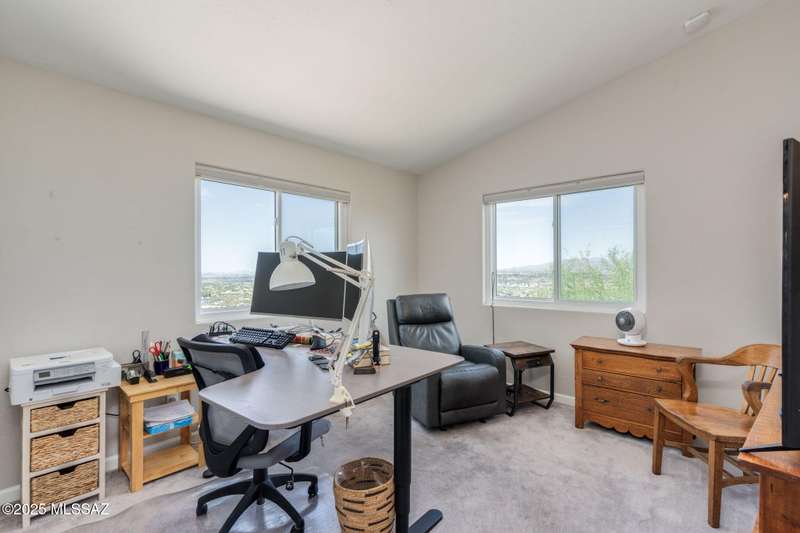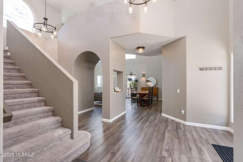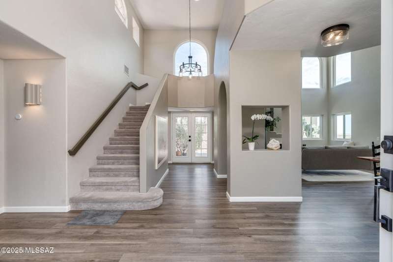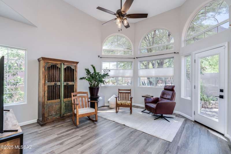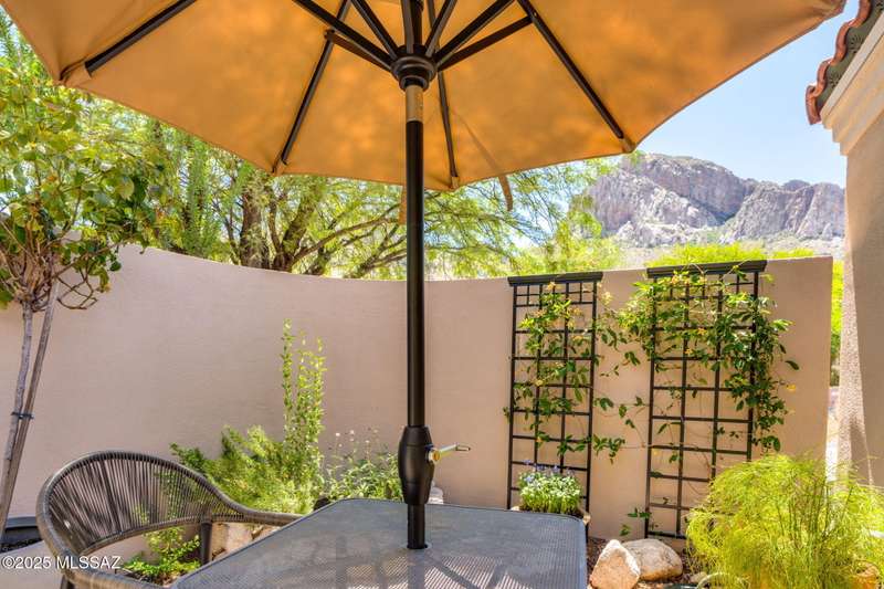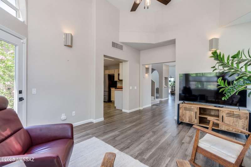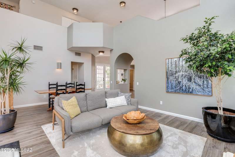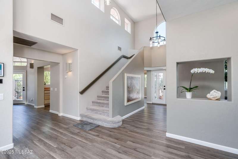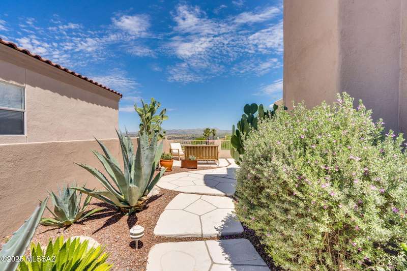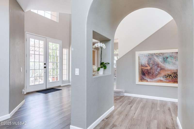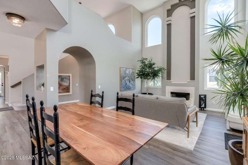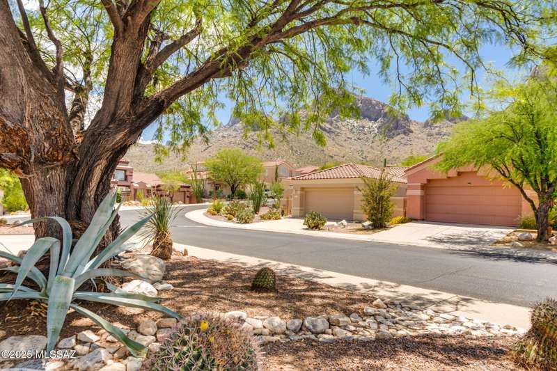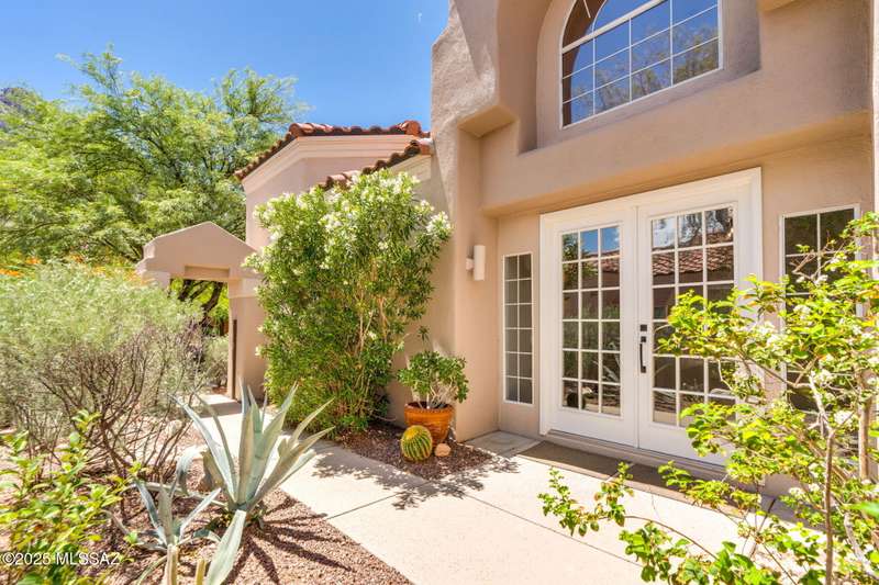 Contemporary 3BD/2.5BA +Den (2,678 sf) residence situated high on THE RIDGE in prestigious, guard gated La Reserve affords ultimate privacy and views. This elegant two-story home overlooks the valley and beyond boasting dramatic views of Pusch Ridge Wilderness plus awe-inspiring sunsets, valley lights and distant mountain vistas. Charming, gated courtyard flows to a neutral and bright floor plan showcasing soaring & vaulted ceilings, high arched windows, elegant French doors, wood-tone ceramic plank tile, plus dramatic floor-to-ceiling fireplace surround in living/dining room. Spacious den off kitchen opens to a private patio to enjoy your morning coffee. Extended Chef's kitchen with sleek black appliances and abundant storage offers a dining nook opening to a flagstone walkway to rear
