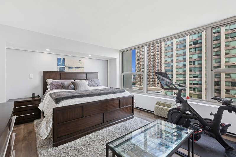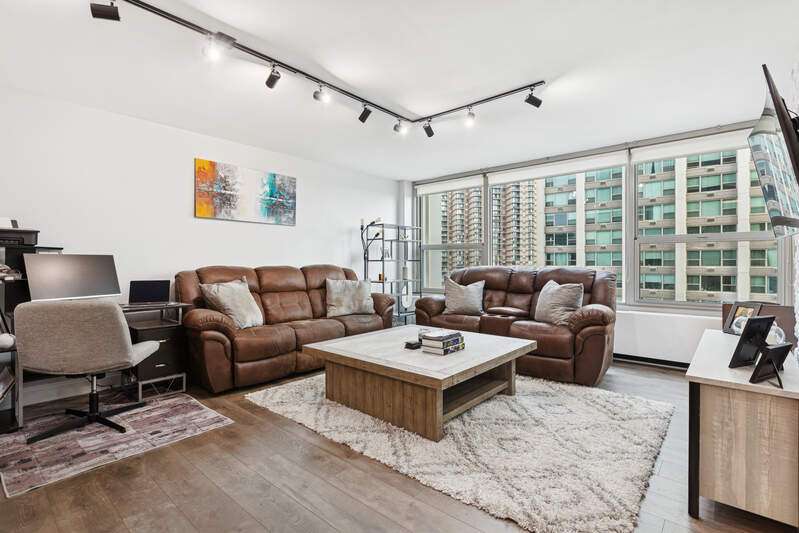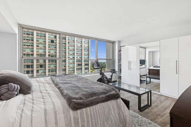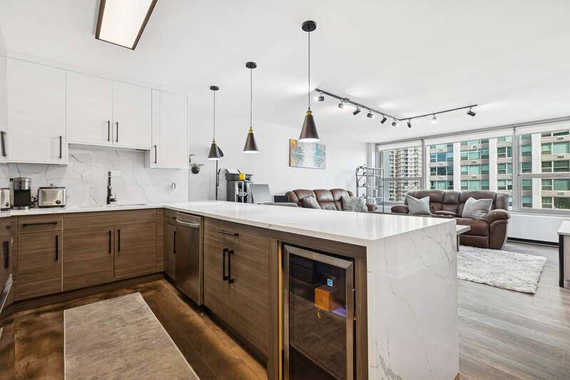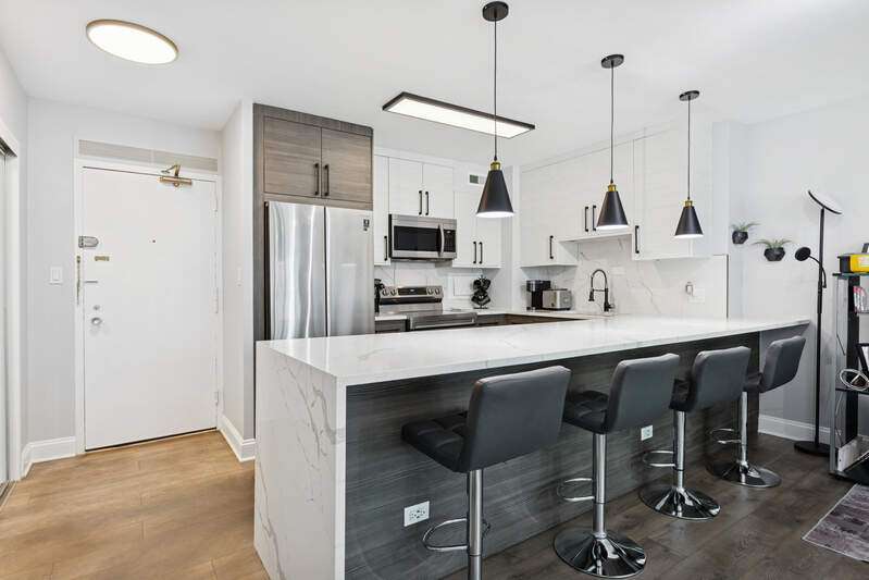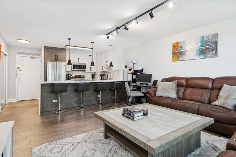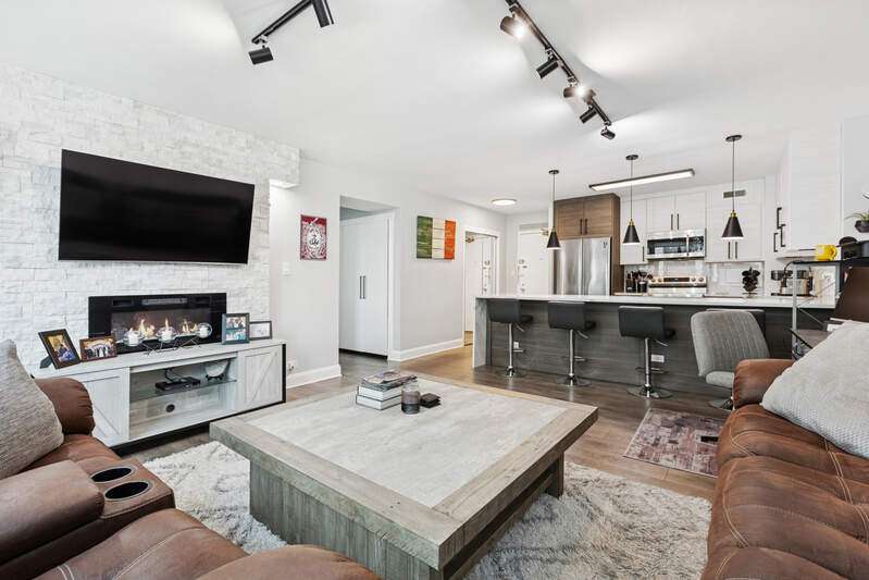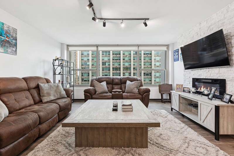 Stylishly Renovated 1-Bedroom in Full-Amenity Building! This beautifully updated home features a sleek modern kitchen with a mix of wood and white cabinetry, quartz waterfall countertops, a full quartz backsplash, stainless steel appliances, and a built-in wine fridge. The spacious living area includes a cozy electric fireplace and space for a dining table-perfect for entertaining. The large primary bedroom boasts custom closets and designer lighting, while the updated bathroom offers a walk-in shower and Euro-height vanity. Engineered wood flooring run throughout the unit, and there's ample storage space throughout. Enjoy stunning park and lake views! Conveniently located near the Addison Red Line and all the dining, shopping, and entertainment that East Lakeview has to offer.